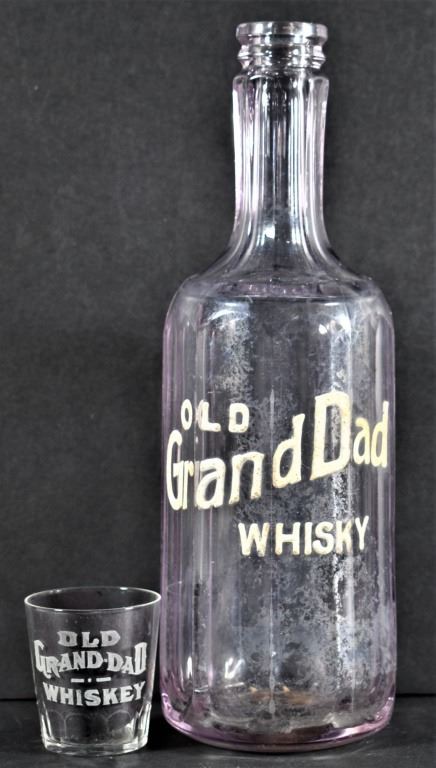 Enamel Label Back Bar Bottle for Old Grand-Dad Whisky and etched shot glass. Chip on lip of bottle, 10 3/4 inches tall. Shot glass has no chips or crack.