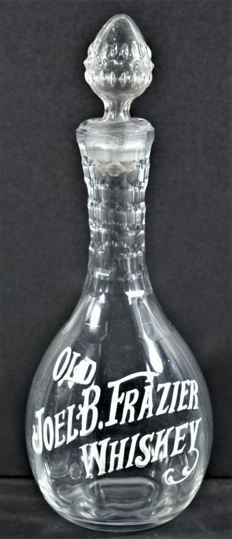 Enamel Label Decanter for Old Joel B. Frazier Whiskey. Beautiful honeycomb décor at neck. Glass blown topper. 11 1/2 inches overall.