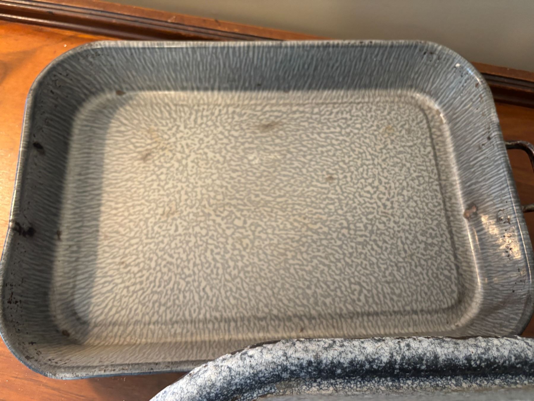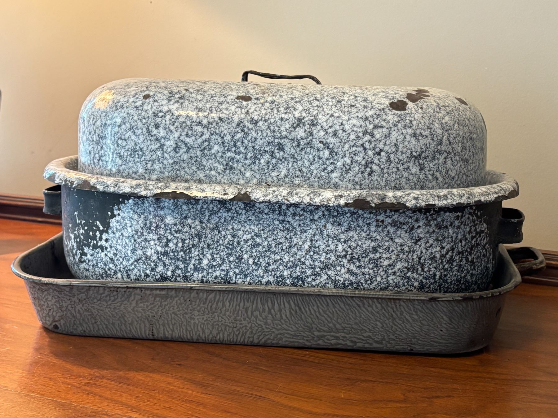 Enamel roaster with lid and baking dish.16” long x 12” wide, 8” deep: roaster
