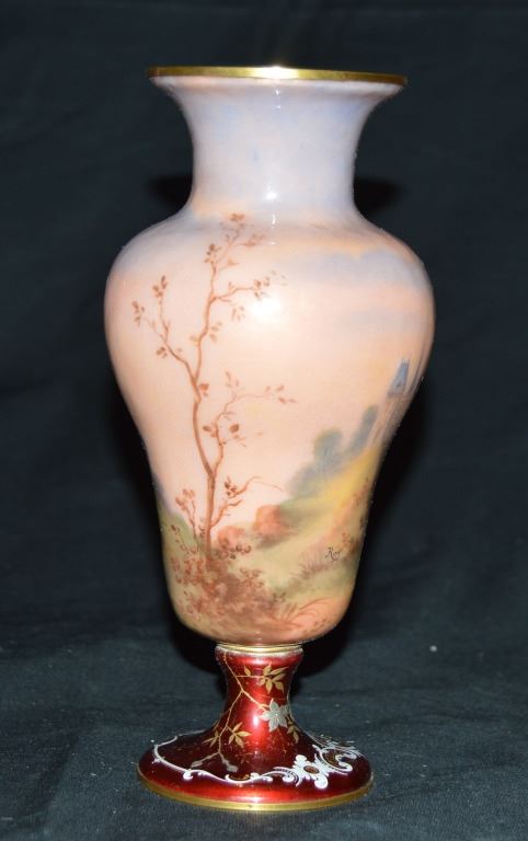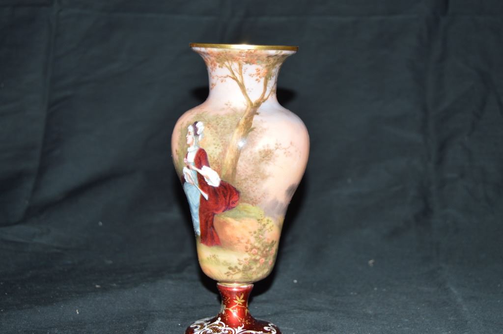 Enamel Setting Lady Vases Antique French Gilt Metal Mounted And Hand-painted Enamel Vase. It Has Been Beautifully Hand-painted In Rococo Style. The 18th Century Figure Of A Seated Noblesse Uterine Is Depicted In A Landscape. The Circular Base Of Red Enamel Has A Raised Painted Floral Design. The Interior Has Been Gold Gilded. Signed By Artist, Roy. Excellent Workmanship And Condition Overall. The Mount Is Not Hallmarked As Is Often The Case. It Is Gilt Metal Or Possibly Silver (not Tested). By Style The Vase Would Typically Be From The French City Of Limoges, Renowned For Its Enameled Pieces. France Circa Early 1880- Height 8 ½"