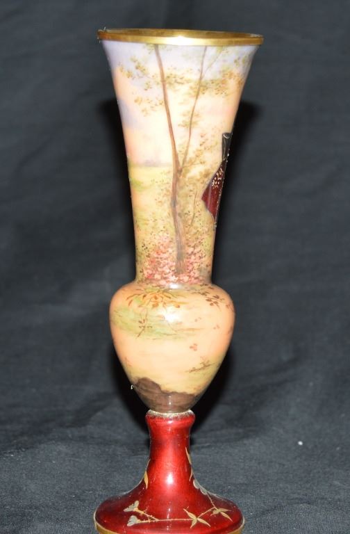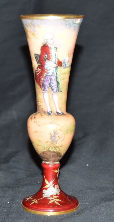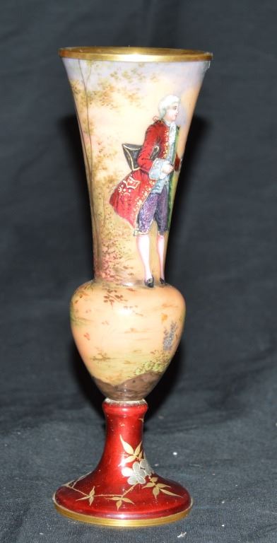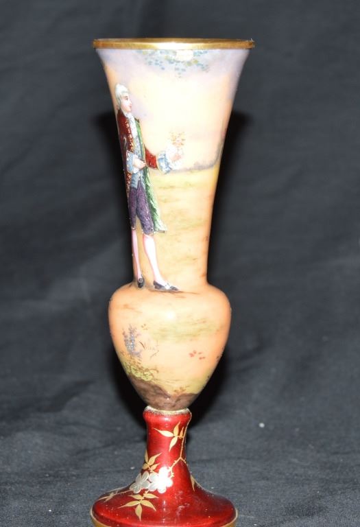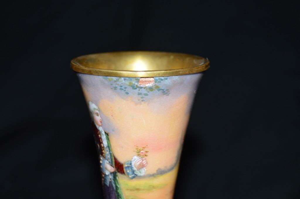 Enamel Standing Gent Vase Antique French Gilt Metal Mounted And Hand-painted Enamel Vase. It Has Been Beautifully Hand-painted In Rococo Style. The 18th Century Figure Of A French Noble Is Depicted In A Landscape. Signed By The Famous French Artist, Vibert. The Circular Base Of Red Enamel Has A Raised Painted Floral Design. The Interior Has Been Gold Gilded. Excellent Workmanship And Condition Overall. The Mount Is Not Hallmarked As Is Often The Case. It Is Gilt Metal Or Possibly Silver (not Tested). By Style The Vase Would Typically Be From The French City Of Limoges, Renowned For Its Enameled Pieces. France Circa Early 1880- Height 7 7/8"