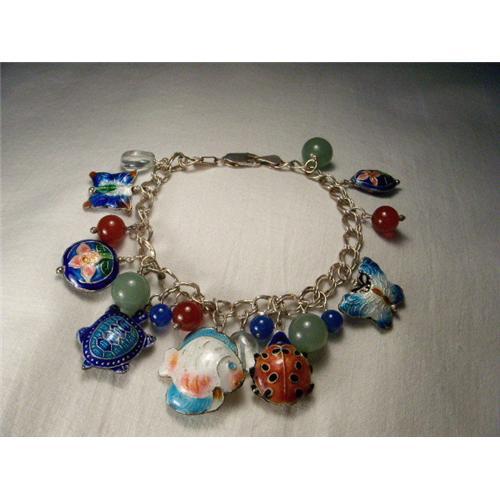 You are looking at an estate enameled silver charm bracelet with gemstone beads. This unique piece features variously shaped and sized crystal, blue onyx, red carnelian, and green jade beads measuring between 10 mm, 8 mm, and 6 mm in diameter. All gemstones are natural. The piece also features beautiful Cloisonne charms including fish, butterflies, a ladybug, and a turtle. The bracelet measures 7 and 3/4 inches long. It weighs 26.6 grams. It is in mint condition.
