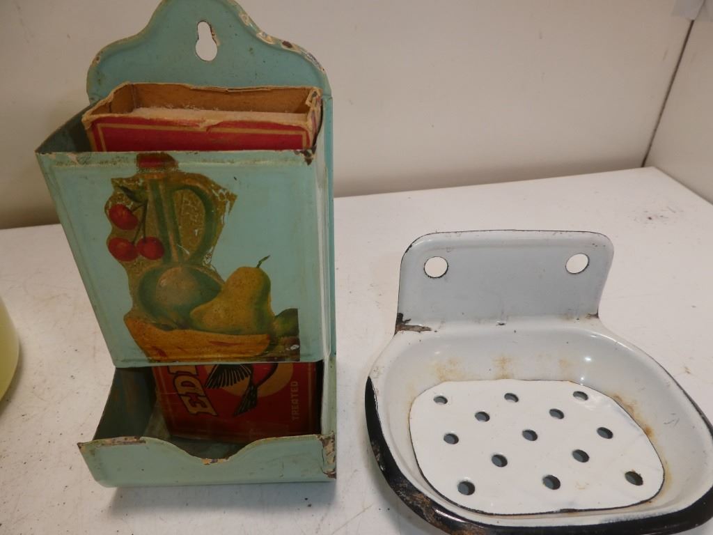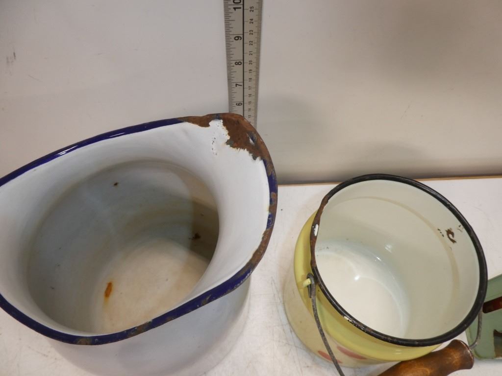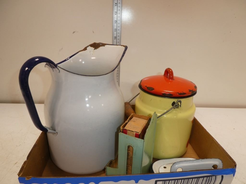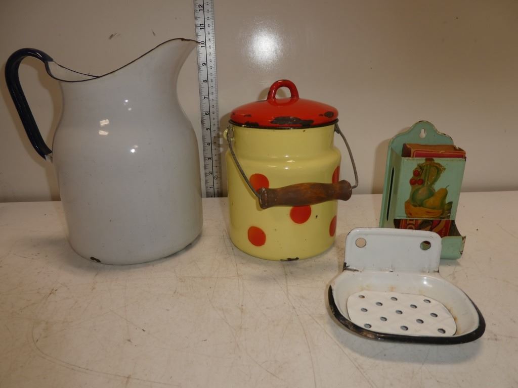 Enamel Ware: Jug, Lidded Bucket, Soapdish