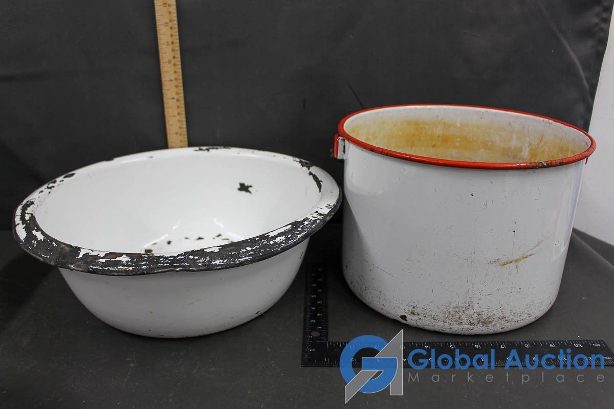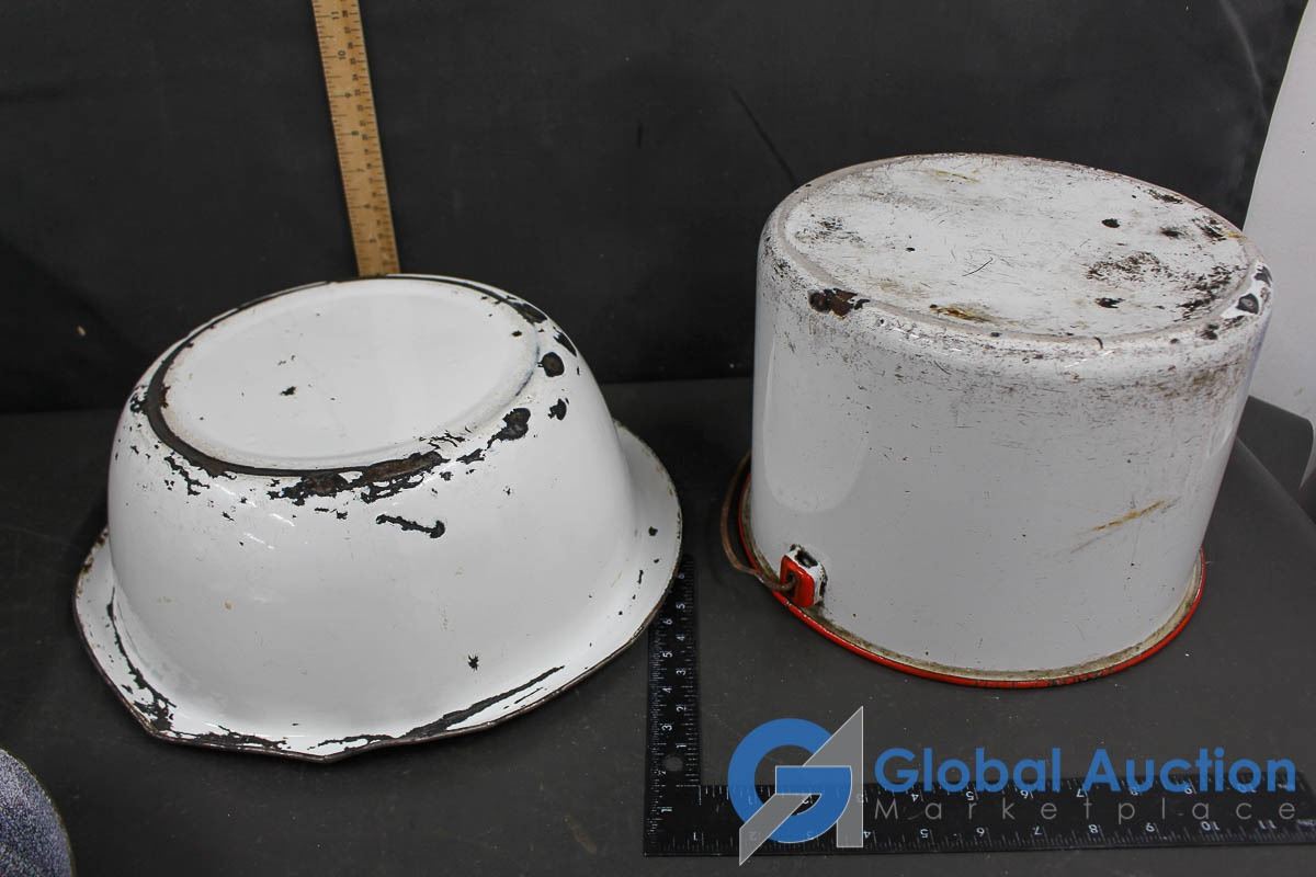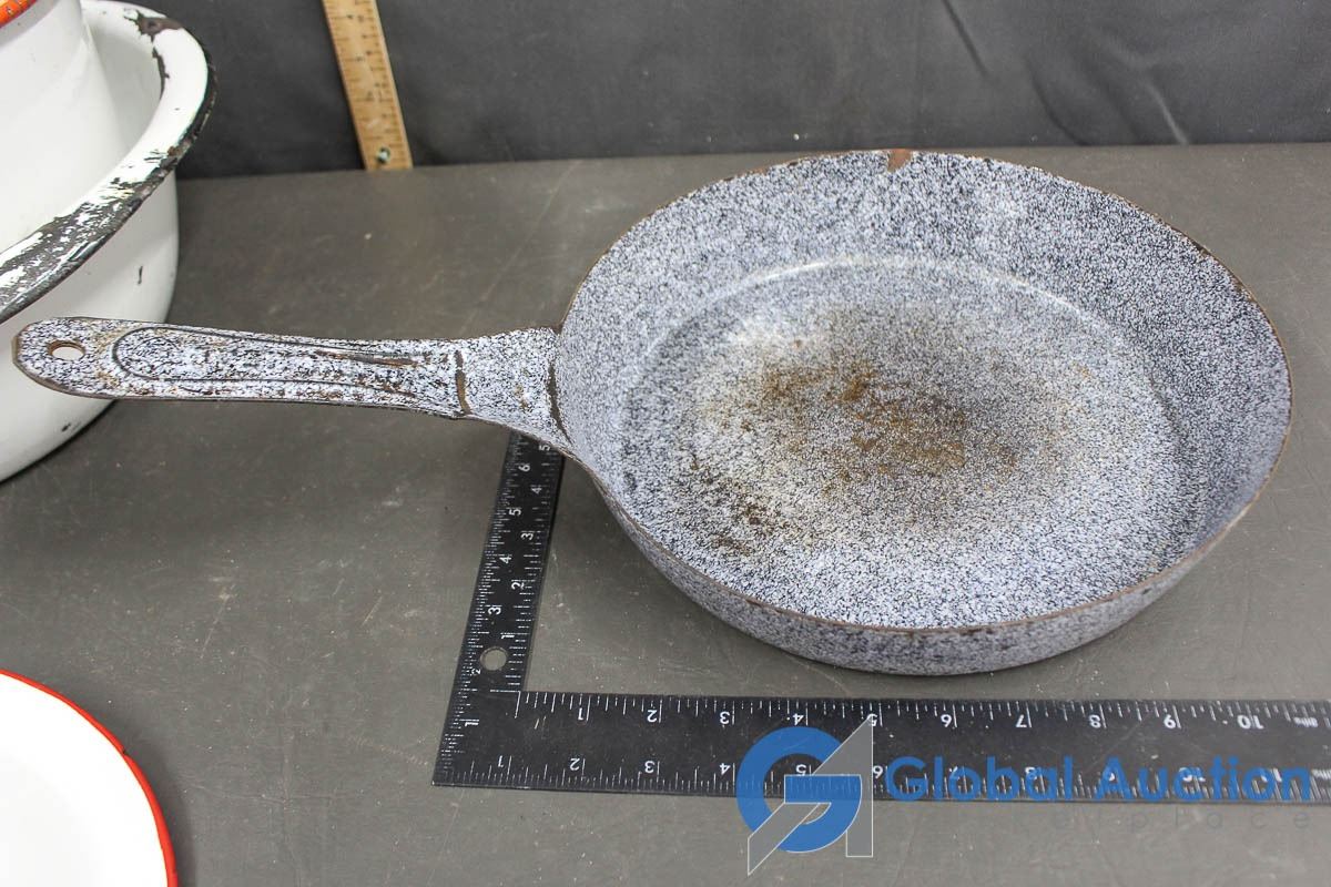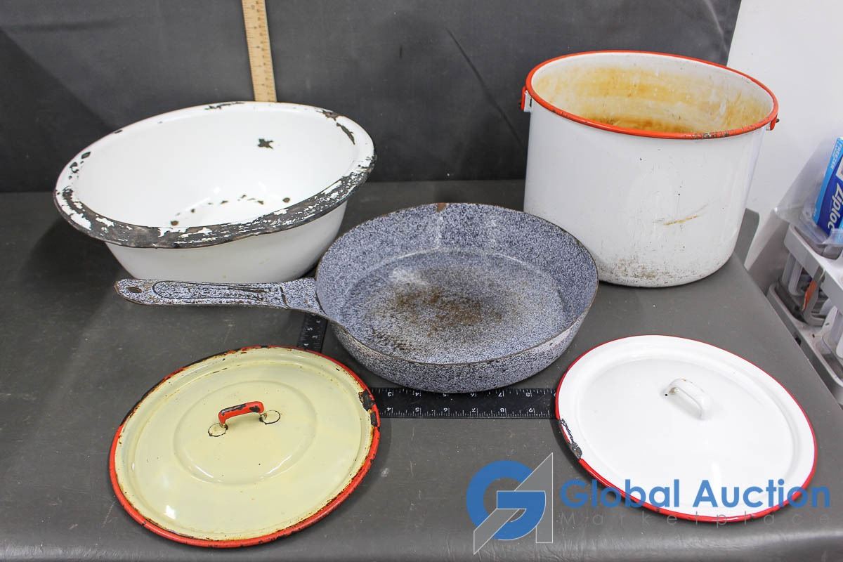 Enamel Wash Basin, Large Pot, Frying Pan, etc