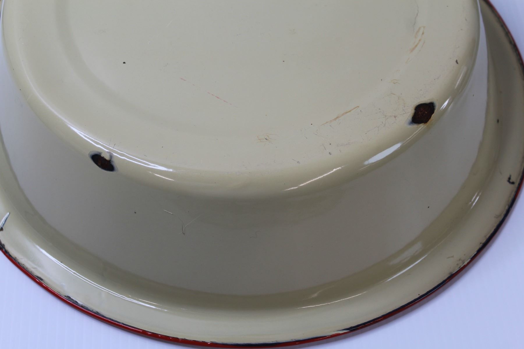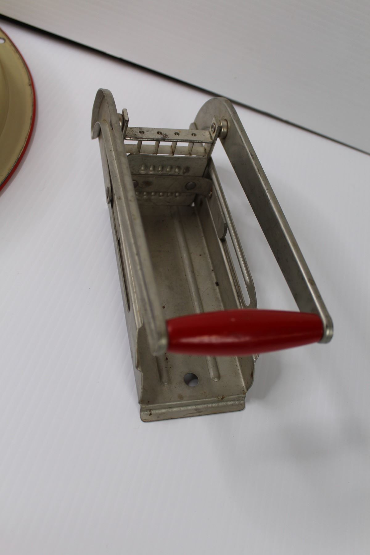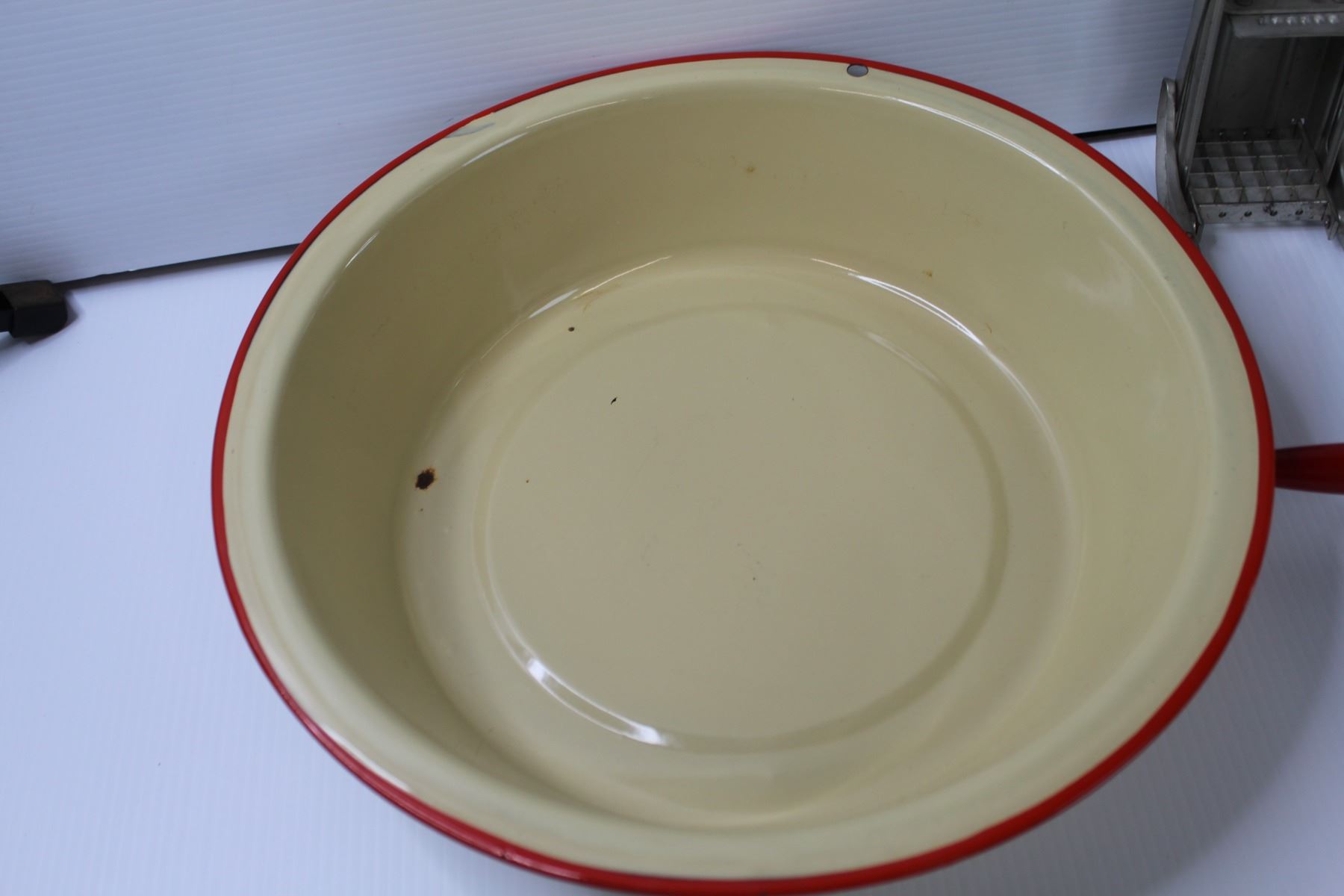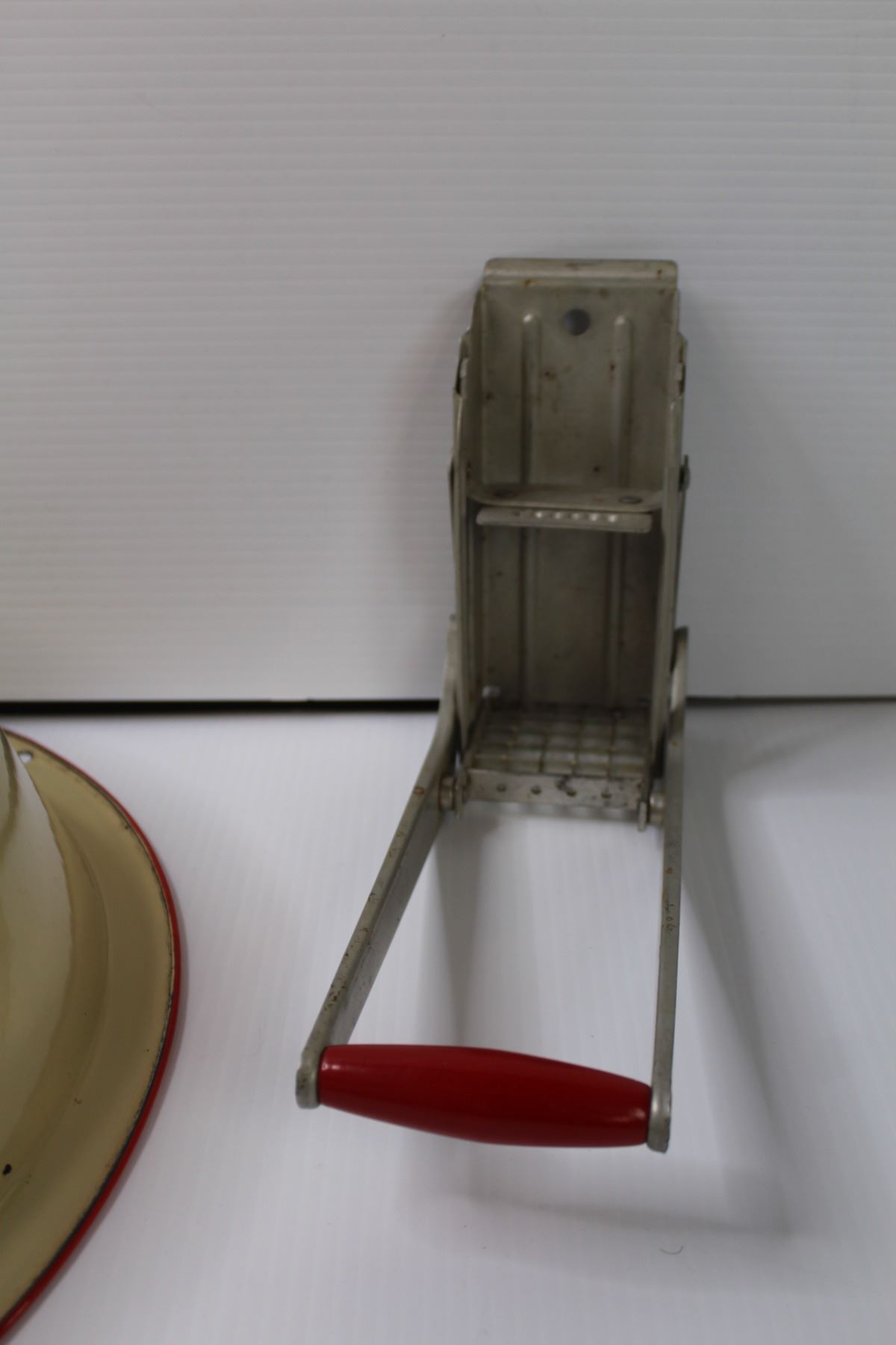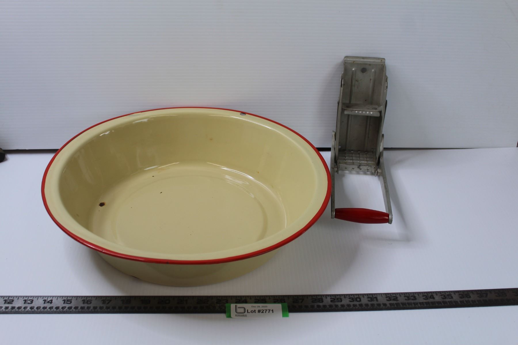 Enamel Wash Bowl (Worn/Rust Spots), Fry Slicer (Wall/Counter Mount)