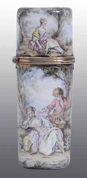 Description French. Exquisite work with scene of ladies in woods depicted. Includes original glass stopper and strong hinge. Condition (Excellent). Size 3" T.