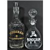 Enamel and Etched Label Pinch and Back Bar Bottle for Monogram Whiskey. Enamel label pinch bottle, 9 inches tall. Gold etched leaded glass bottle, 10 1/2 inches tall.