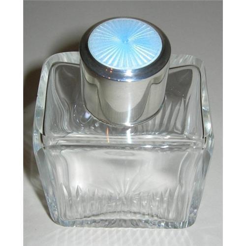 A wonderful and stylish Art Deco inspired cut glass perfume or cologne bottle with a cut line decoration up the sides and a star -cut base.<p>The solid or sterling silver screw top is clearly hallmarked for Birmingham 1937 together with the makes initials A C for Arthur Cook.<p>The inside retains it's original cork Stopper with metallic top to prevent evaporation of the precious contents.<p>The lid is decorated with a pastel ice blue guilloche enamel which remains without damage.<p>The bottle is in spectacular condition with no chips, cracks or repairs. Measures 2 1/8" x 1 1/2" x 3 1/4" tall.