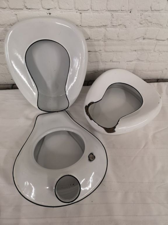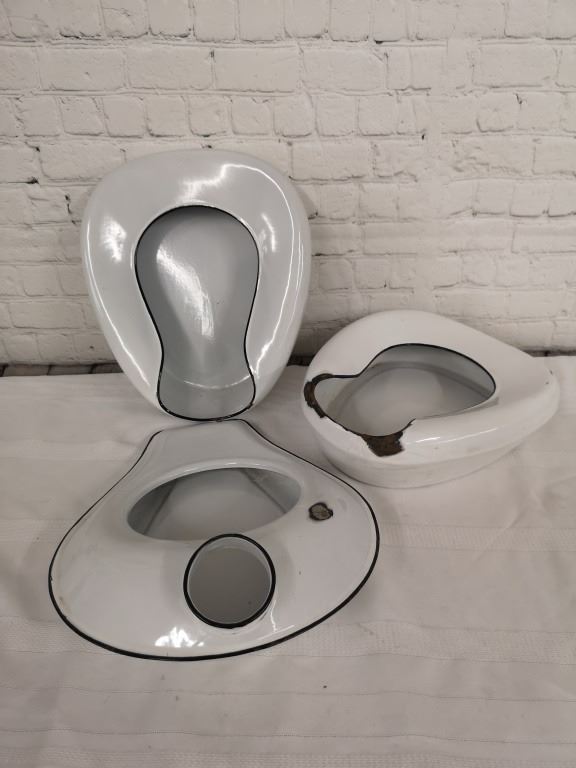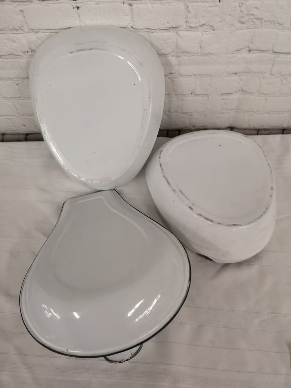 These enamel bed pans come to you in good pre-owned condition with some rust and scuffs present due to age and use. These bed pans approximately measure 13.5 in long and 11.5 in wide X2 and the other bed pan measures