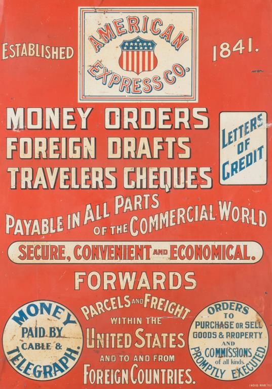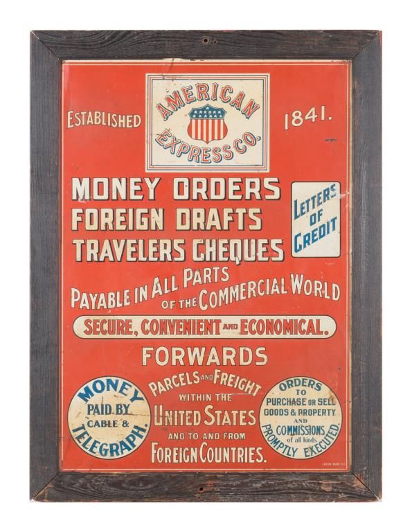 Enamel on tin advertiser for “American Express Company” in original wood frame measuring approximately 31” x 23” in width to the outside edges. The sign measures approximately 28” x 19”. The painted portion is in good condition with some scratches, minor losses and some dents. The right corner shows the number 4018 indicating style and dated March 1911. The sign advertises money orders, drafts, traveler’s checks, telegraph payment and etc. From the premier Robert Hoelscher collection and guaranteed authentic. Note: some minor holes and nails in the frame from being mounted. Est.: $400-$800