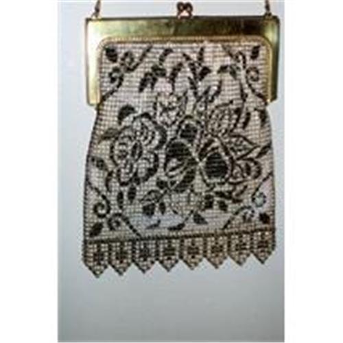 A beautiful cream and brown enameled mesh floral pattern Whiting and Davis bag. A very unusual color combination. The bag has a brass frame and is in excellent original condition.