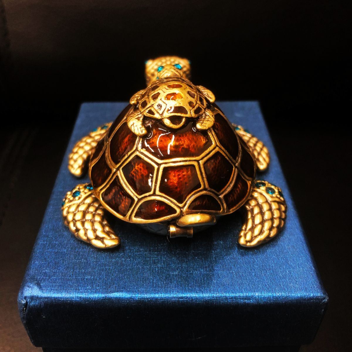 Enameled Mother & Baby Turtle Ring Box With Blue Semi Precious Stones. Comes With Box. An Excellent Gift Idea. View Photos For Further Details.