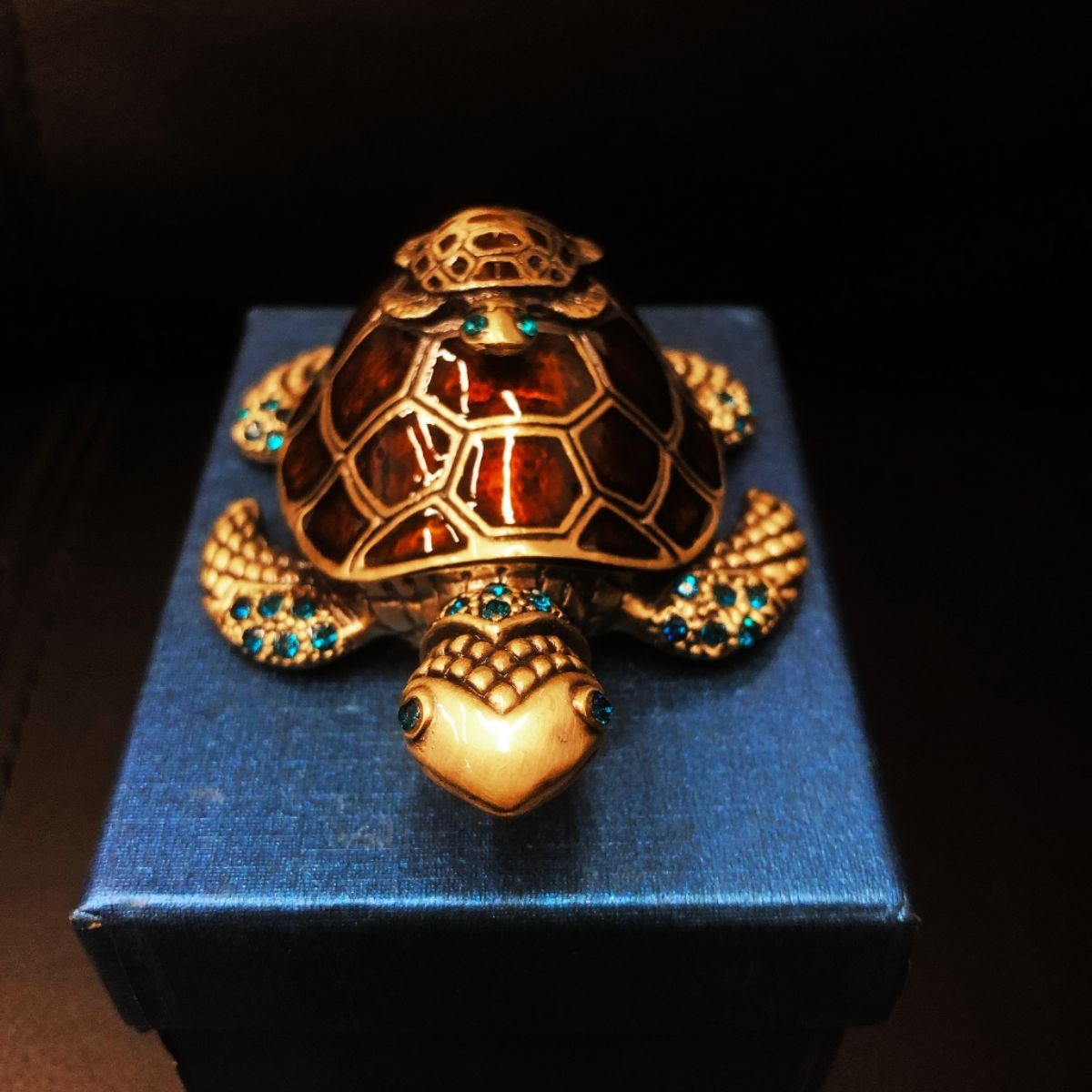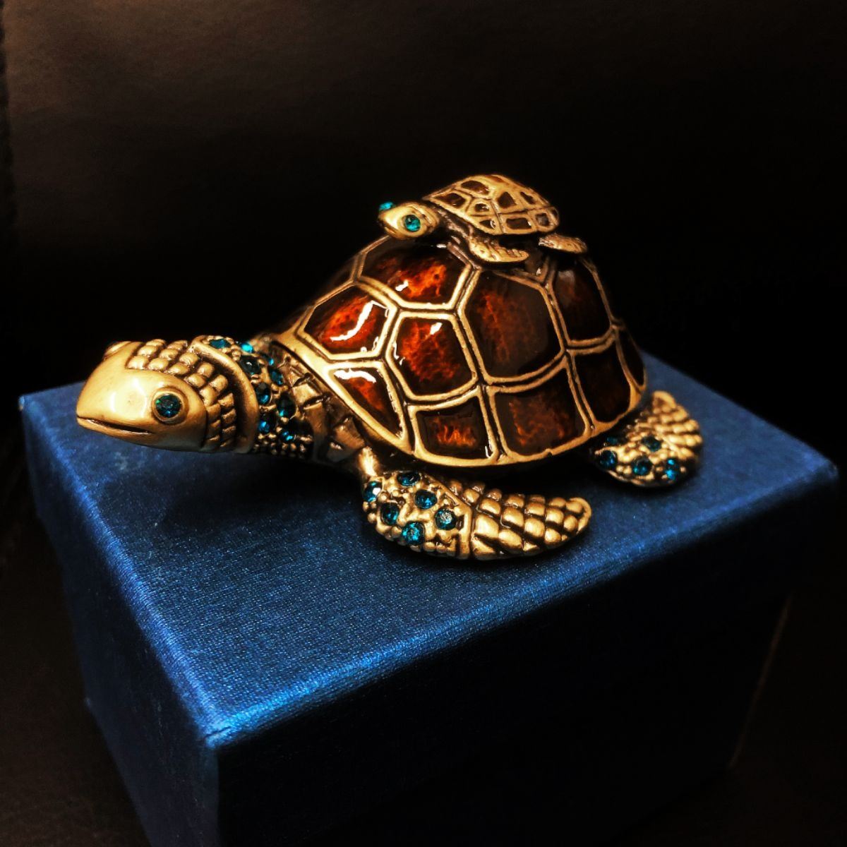 Enameled Mother & Baby Turtle Ring Box With Blue Semi Precious Stones. Comes With Box. An Excellent Gift Idea. View Photos For Further Details.Â
