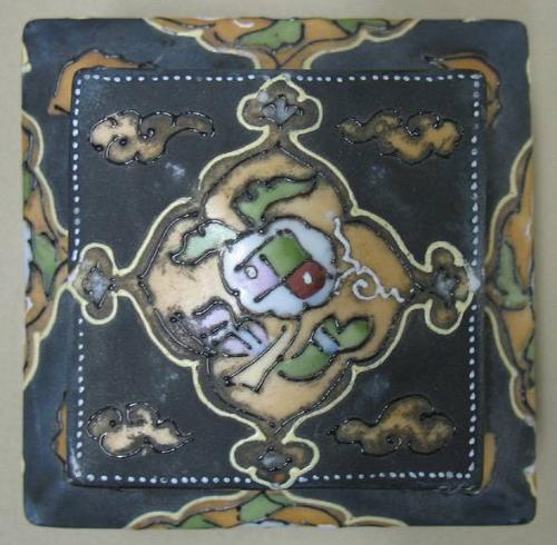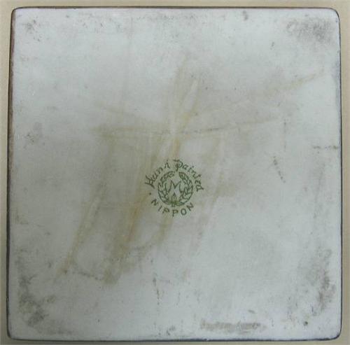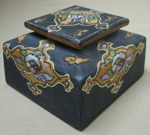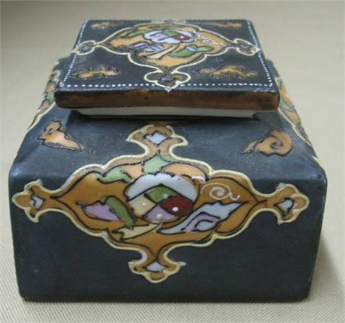 Enameled Nippon inkwell; square form; hand painted enameled design on lid and each side on dark gray ground; green M mark on bottom; early 20th C.; measures 2 1/2" high x 3" diameter (no visible defects)