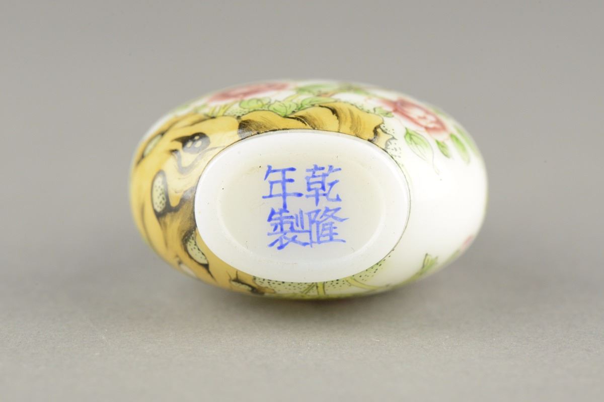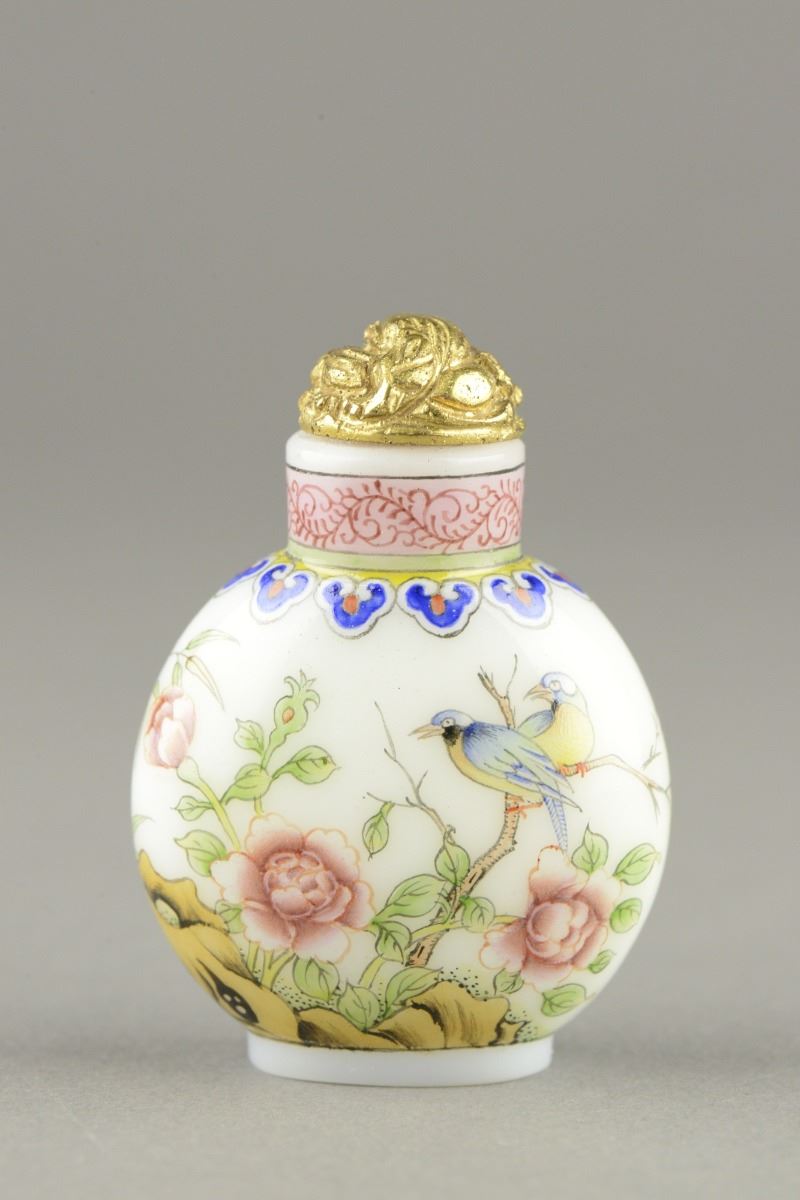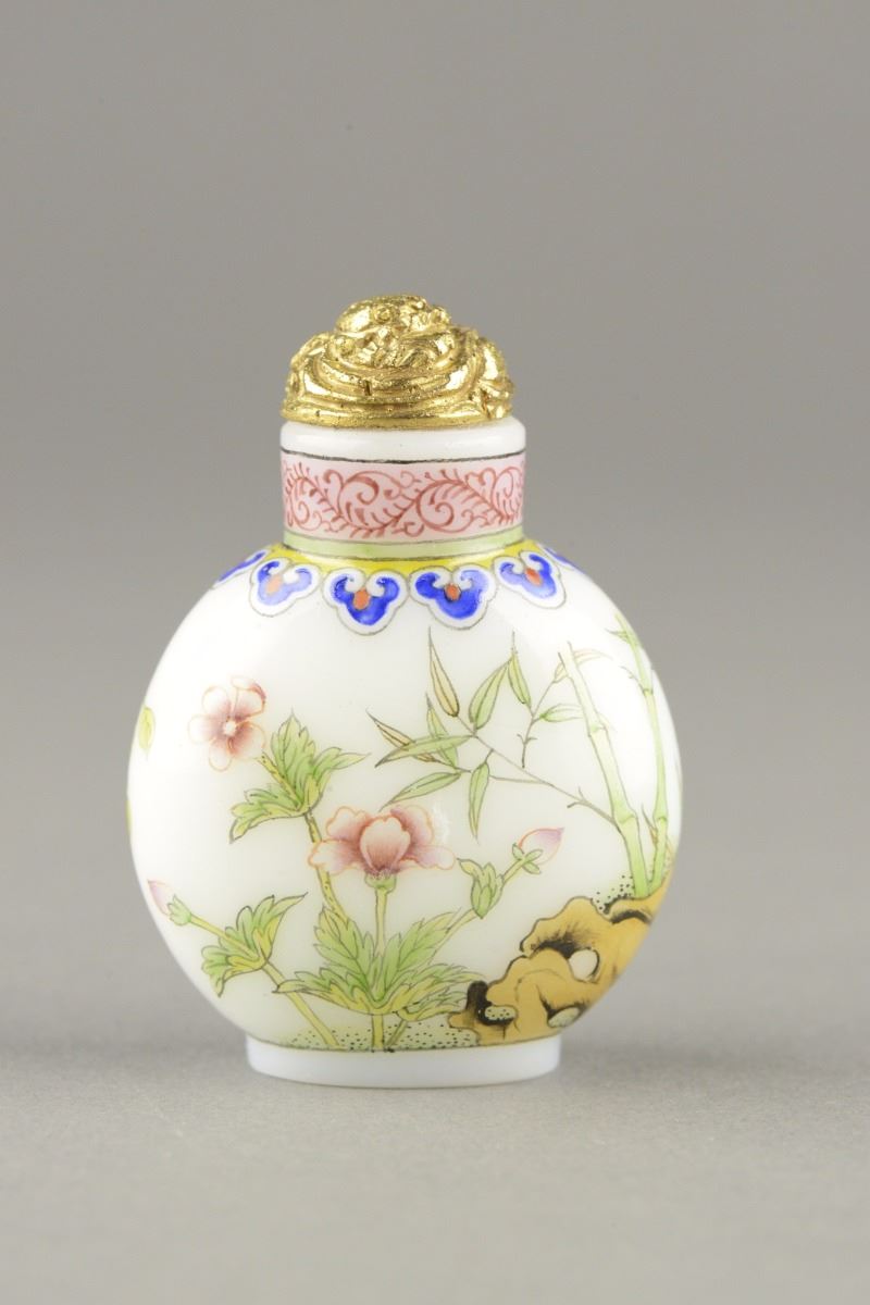 Chinese milky glass snuff bottle; richly enamel painted with auspicious flowers and bamboo; neck painted ruyi heads and floral sprays; with gilt cap; four-character Qianlong mark on base; H: 5.5 cm, W: 4 cm, 46 grams