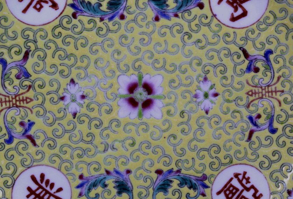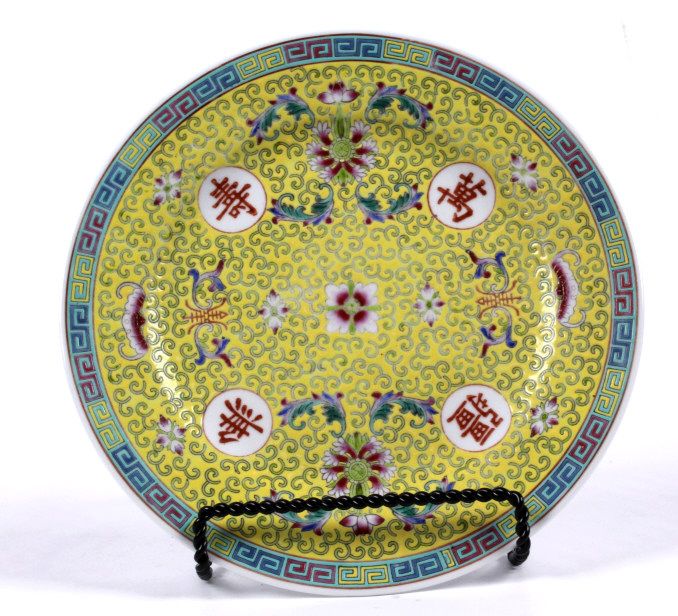 This piece is hard paste porcelain plate that is has a stamped red enamel chop mark. This piece shows great enamel quality with intricate pattern designs with 4 stamped character marks and a leiwein design around the edge. Measures 9 7/8" in diameter and 7/8" tall.