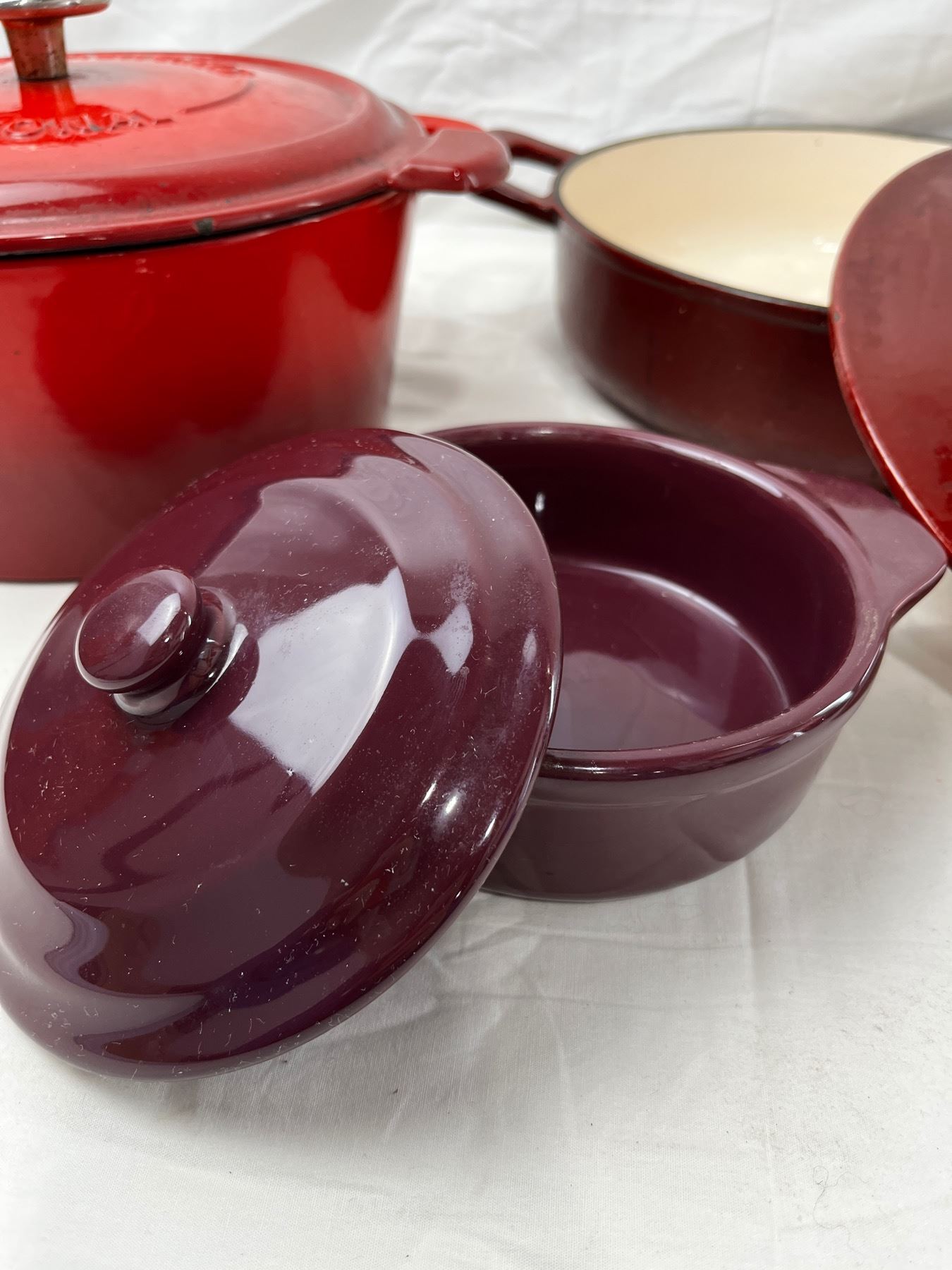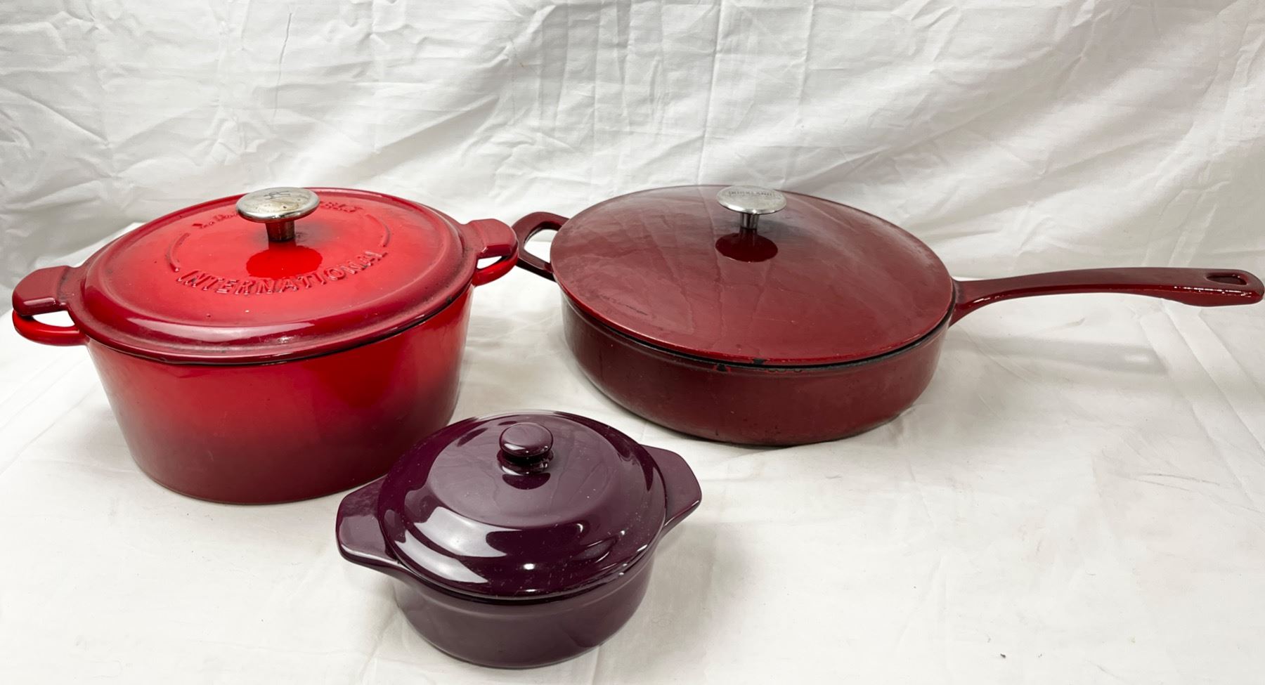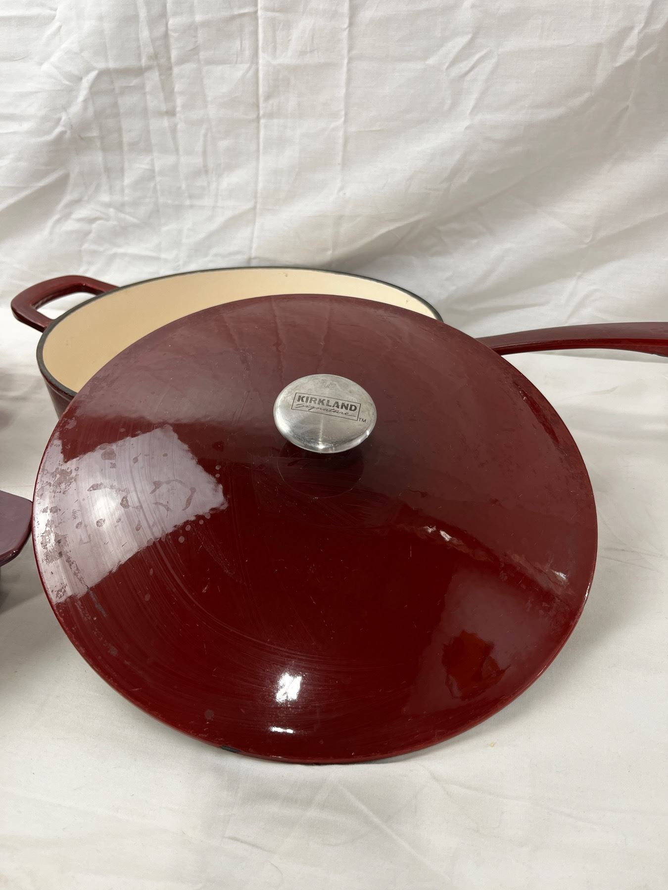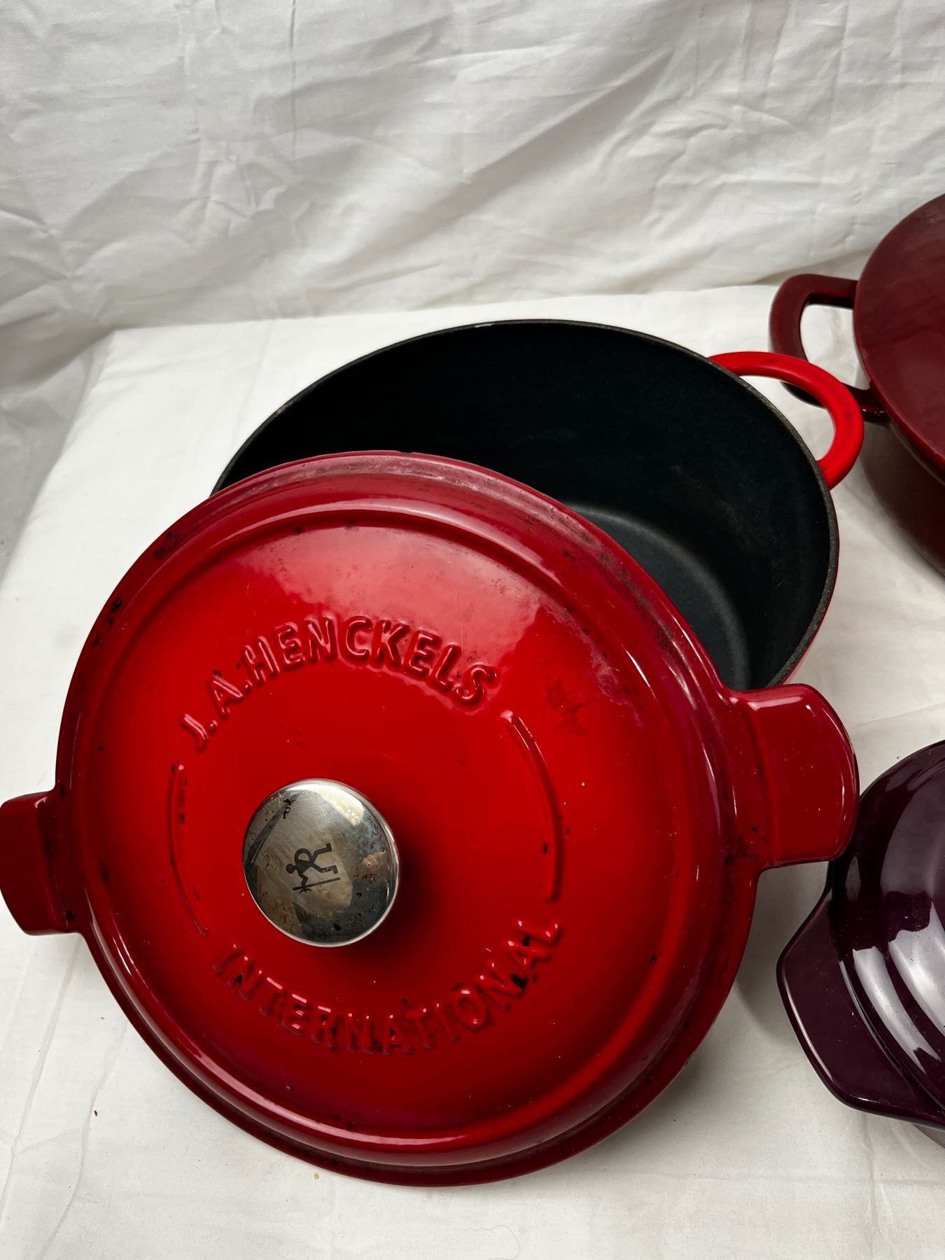 3 pieces including small ceramic casserole dish - J.A Henckels 24" Pot - Kirkland Pan - Henckels and Kirkland are cast iron