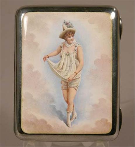 Enameled silver cigarette case with provocative woman lifting blouse. Ex. cond. Approximately 4" x 3"