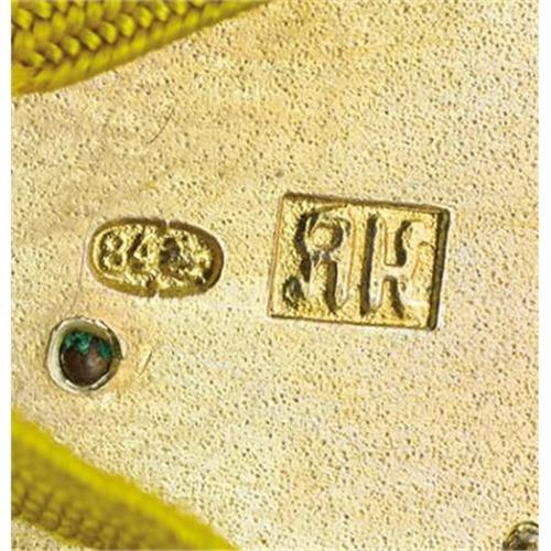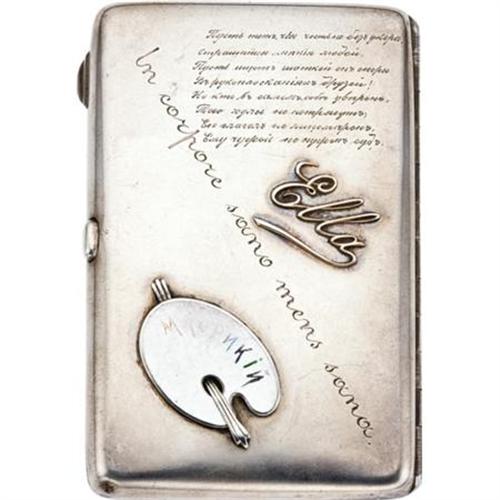 <B>Imperial Russian Silver and Enameled Souvenir Cigarette Case</B></I><BR><I>Marked Moscow, 1880</B></I><BR><BR>Profusely decorated with gold ciphers, a crown, signatures, and ace of spades in white enamel, the reverse applied with a white enamel pallet and silver brush, an inscription in Russian and applied with the name <I>Ella</B></I> in gold-4 x 2 3/4 in. <BR><BR>Provenance:<BR>Purchased from Manhattan Art & Antiques Center, New York<BR><BR><b>Shipping:</b> Requires 3rd Party Shipping (<a target="_blank" href="http://www.heritageauctions.com/common/shipping.php">view shipping information</a>)