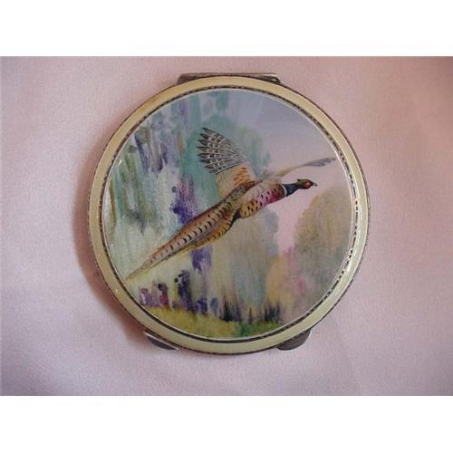 Very beautiful large enameled sterling compact with a pheasant. This detailed pheasant is flying through a watercolor like background. A pale yellow guilloche enameling encircles the border. Compact measures 3 1/2" in diameter. The sterling base is engine turned. The interior is marked "Made in England", plus an "HCD" (maker's mark) and three hallmarks- an anchor, lion, and an "A"- Birmingham 1950. There is a very small dark yellow spot on the border near the hinge (see picture); otherwise, excellent condition (including mirror).