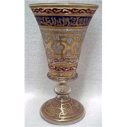 Enameled glass footed vase, gilt and enameled decoration, and banded enameled Persian calligraphy, measures 8" high Estimate 80/150