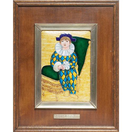Interesting Enameled plaque, probably 1920s French, after Picasso, seated boy, framed,3.5in. x 5.5in.,well done, high quality work