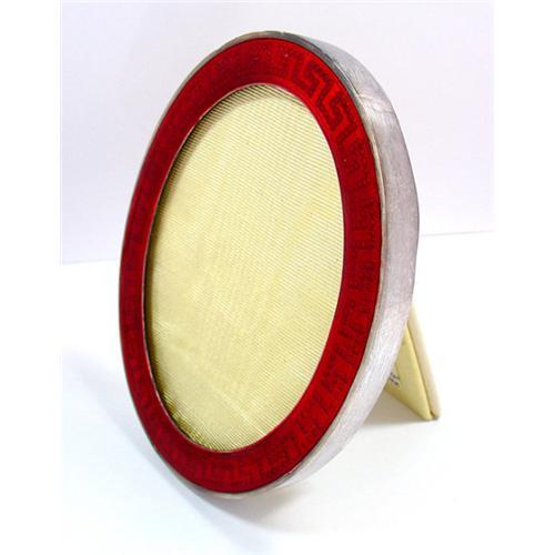 The classic 1920s enameled silver oval miniature easel frame features bright red translucent enamel with a Greek key motif. The back and hinged stand is covered with white leather.(new) A silver latch closure appears on the lower back, and the interior is lined with yellow ribbed fabric. Marks for London 1920 appear on the side of the frame. Size: 4.25" x 3" (10.8cm x 7.6cm); 3.25" x 2.25" (8.3cm x 5.7cm) opening