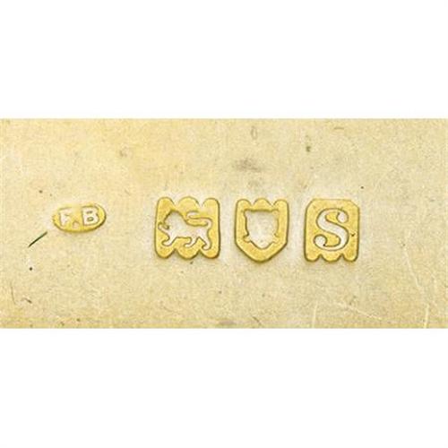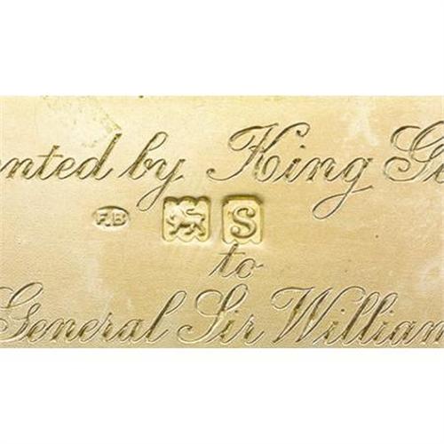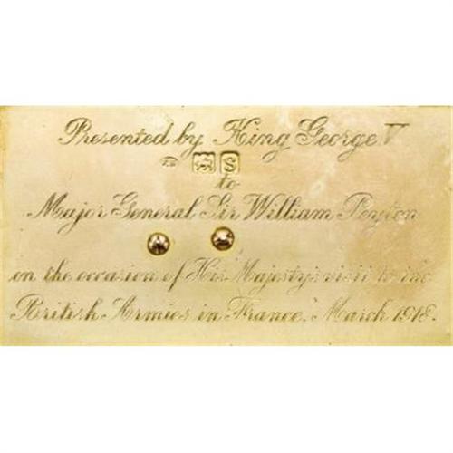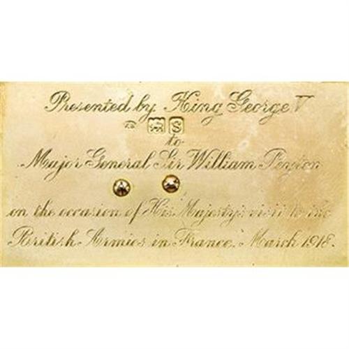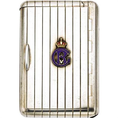<B>English George V Silver and Enameled Royal Presentation Cigarette Case</B></I><BR><I>Marked London, 1918, maker's mark F B</B></I><BR><BR>Rectangular with rounded corners, of vertical reeded design, with tinder cord compartment, match compartment and strike, the hinged cover applied with blue enameled <I>GRV </B></I>for George V Rex (King) of Great Britain (r. 1910-1936)<I> </B></I>below a gold and red enameled British Royal crown, the gilt interior inscribed <I>Presented by King George V to Major General Sir William Peyton on the Occasion of his Majesty's visit to the British Armies in France March 1918</B></I>-3 3/4 x 2 3/8 in. Together with description of General Sir William Eliot Peyton's military career<BR><BR>Provenance:<BR>Purchased from The Armoury of St. James, London