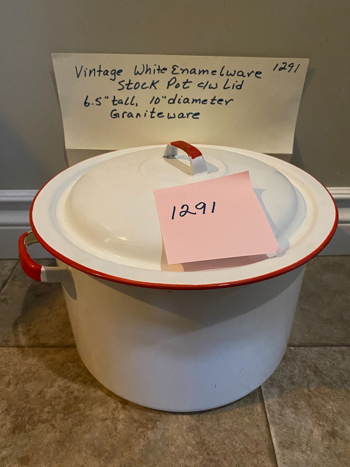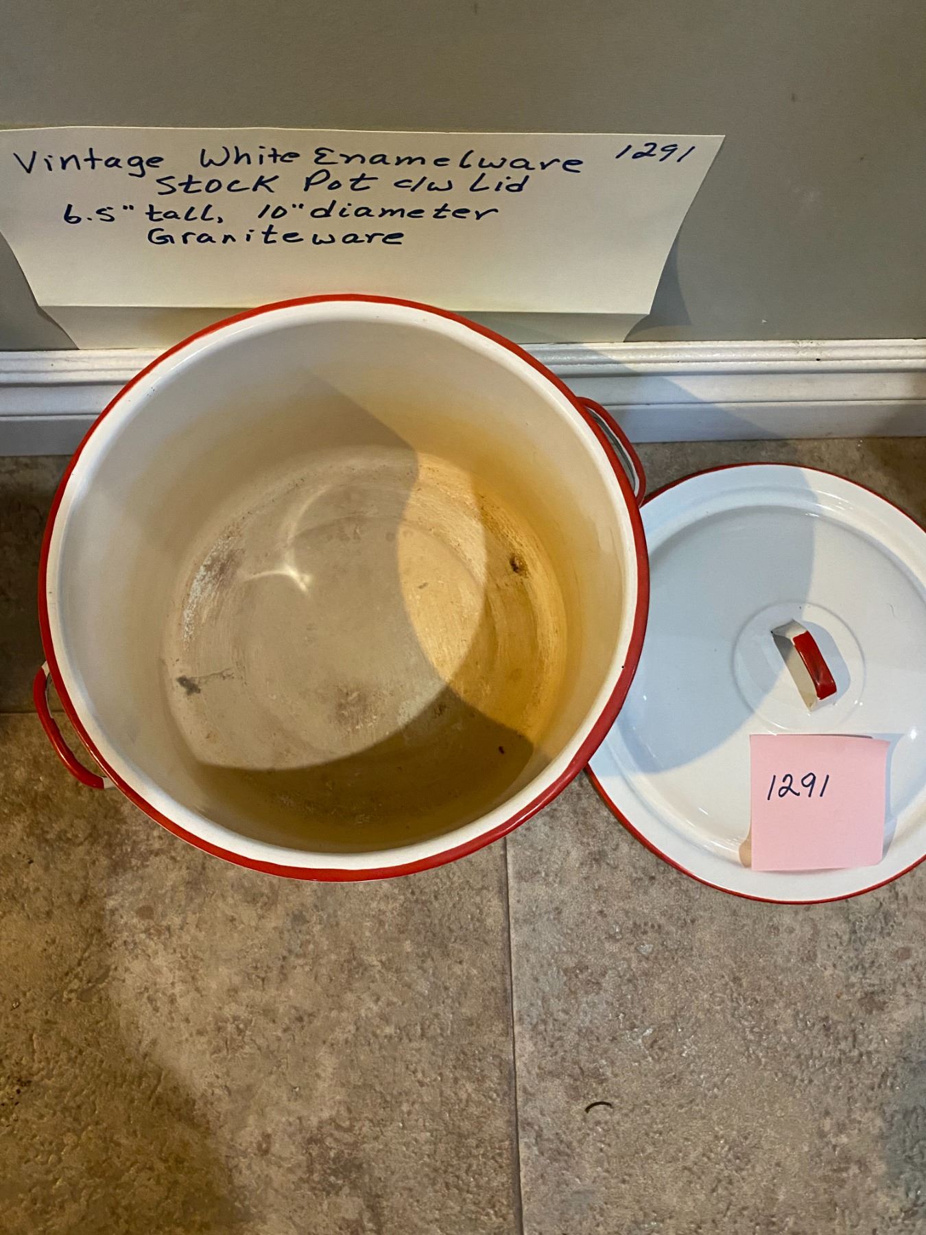 Enamelware/Graniteware Enamel Stock Pot comes with lid. Red trim. 6.5“ tall and 10” in diameter.