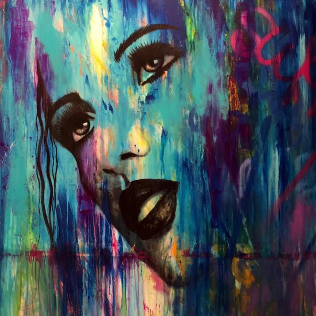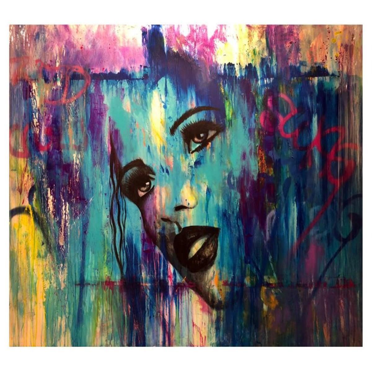 "Enamored" is an original painting, mixed media on stretched canvas, by Jay Johansen. It is hand signed by the artist and accompanied by a certificate of authenticity. Measures approximately 50" x 54" (image).