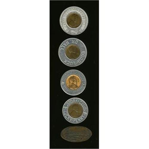 <B>Encased Cent Group Lot.</B></I> An outstanding group of encased pennies and one elongated cent. All the encased pennies are either brown Uncirculated or better, including 1920-S, 1924-P, 1933-P, and 1937-P. The elongated cent is from the 1933 Chicago World's Fair, rolled on a 1915 Lincoln cent. Due to the nature of this lot and the conditions, we suggest that it be viewed.<BR><BR><b>Shipping:</b> Coin/Currency (<a target="_blank" href="http://www.heritageauctions.com/common/shipping.php">view shipping information</a>)