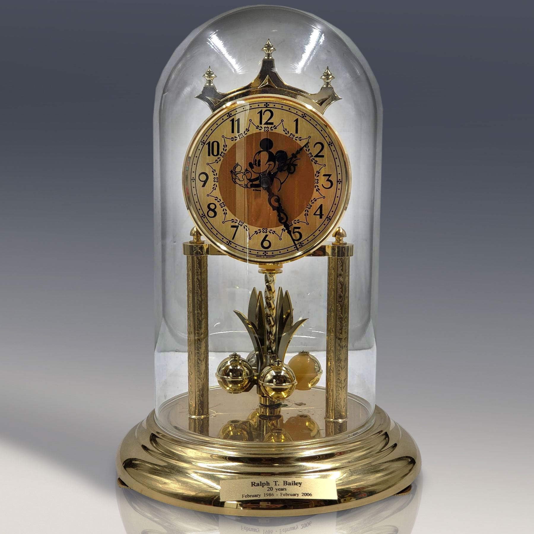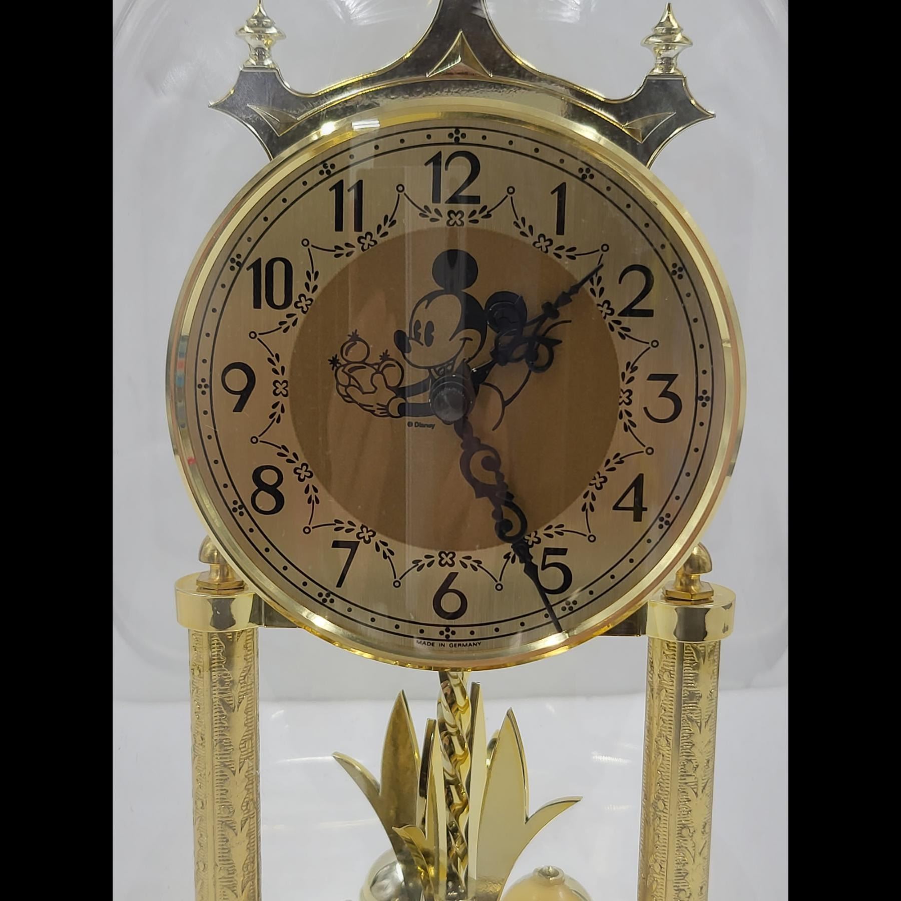 Encased Mickey Mouse Pendulum Clock. Measures approximately 12" tall x 8" diameter.