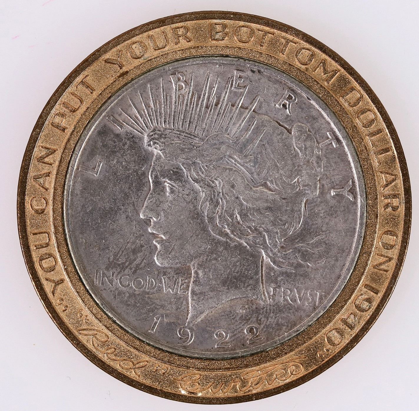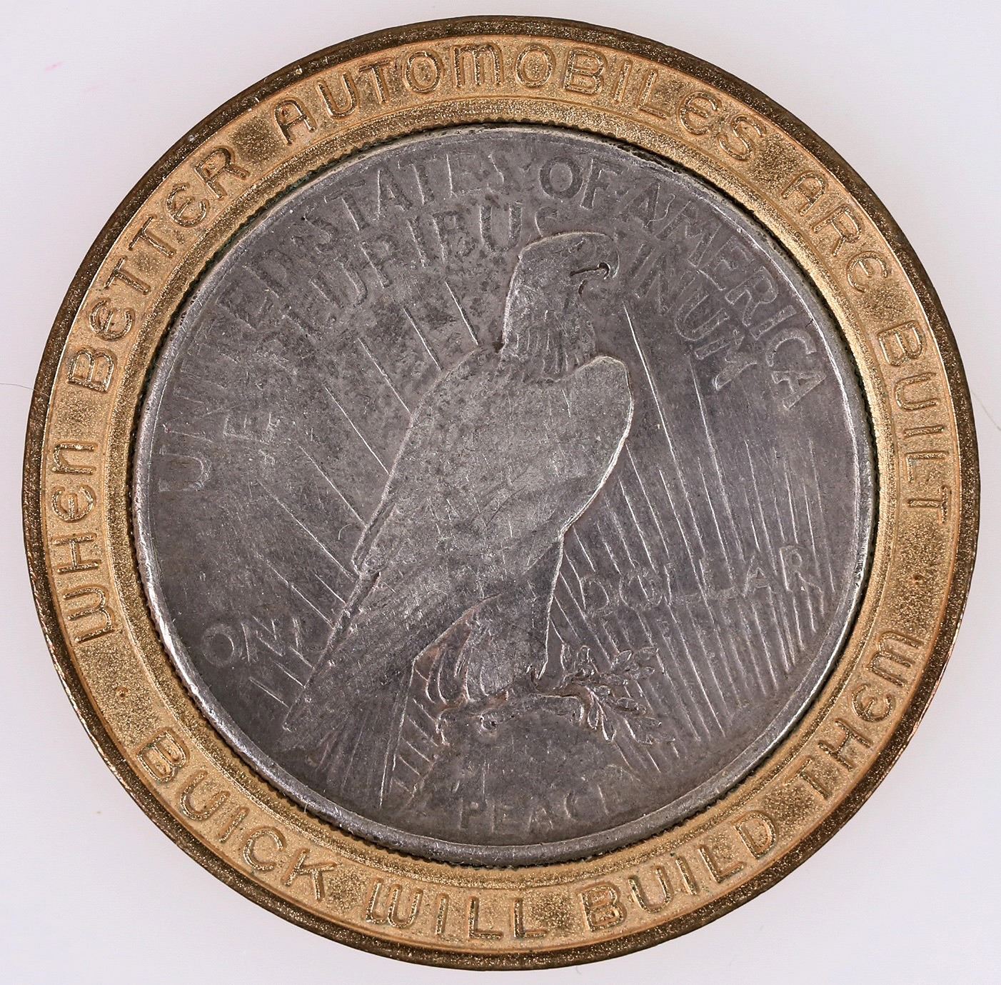 Brass trim around a 1922 Peace dollar (VG-F condition): You Can Put Your Bottom Dollar On 1940 / "Red" Burtico // When Better Automobiles Are Built / Buick will Build Them.