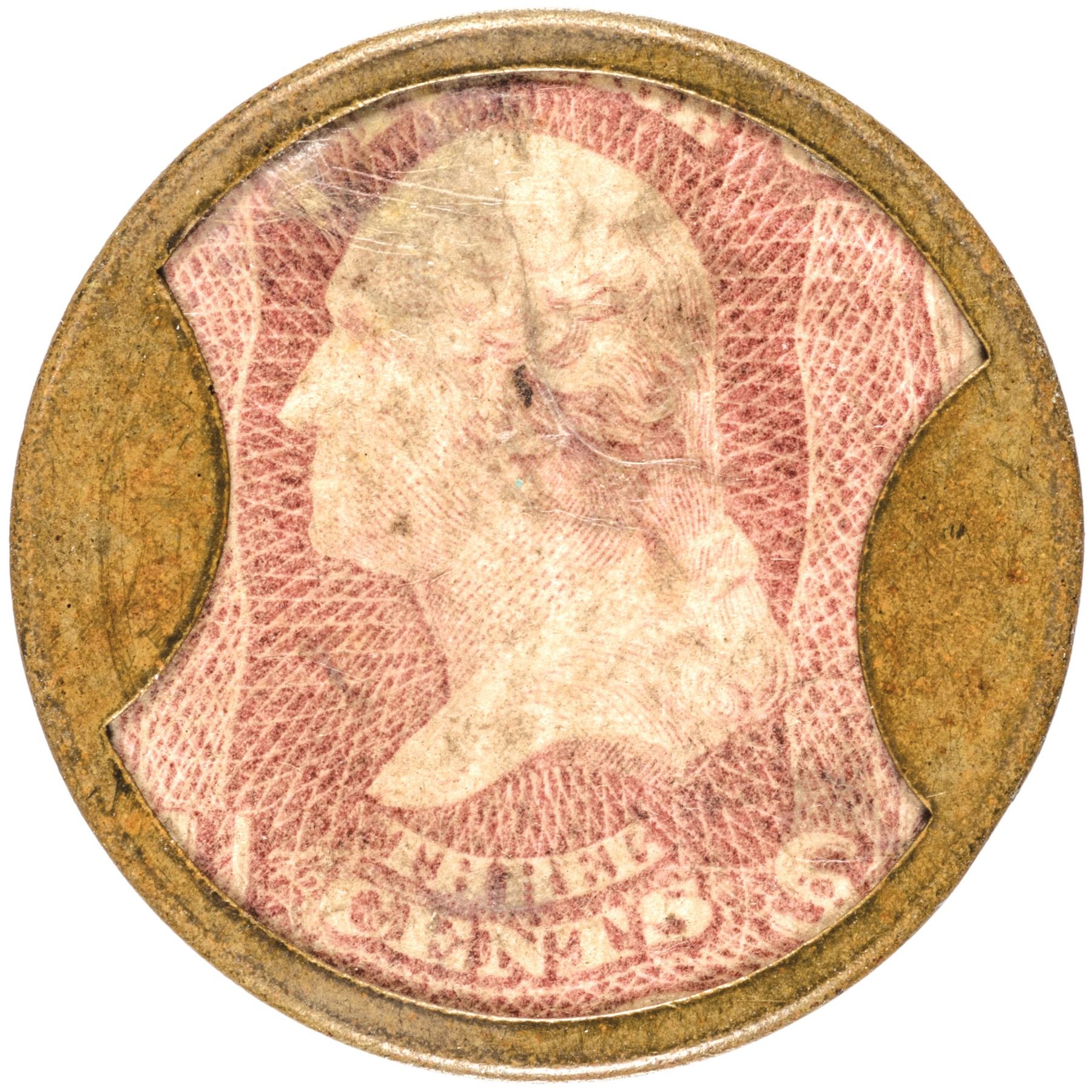 John Gault began “encasing” postage stamps for use as small change. The original patent to him, No. 1627, was granted in August, shortly after the passage of legislation authorizing the use of stamps as currency in July of 1862.