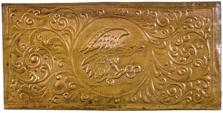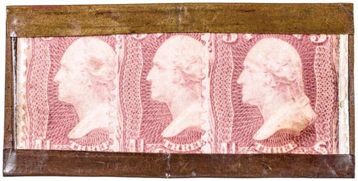 This example of the uniquely designed “Feuchtwanger” Encased Postage Nine Cents denomination. There are three George Washington 1863 issued 3¢ postage stamps that are a nice red and are displayed under a rectangular piece of natural clear mica. The mica itself remains whole, unbroken with some scattered natural internal laminations and a few light scratches. The highly ornate glossy copper-chestnut toned case is extremely sharp with perfectly clear details and has virtually no trace of actual wear.