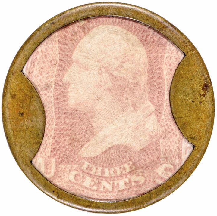 Rated a Rarity-3 (41 to 50 known) according to Fred Reed. The lovely natural chestnut brass case that has exceptionally sharp detail to its legends. The mica is perfectly clear and defect-free, nicely displaying the red 1863 issued well centered George Washington stamp.