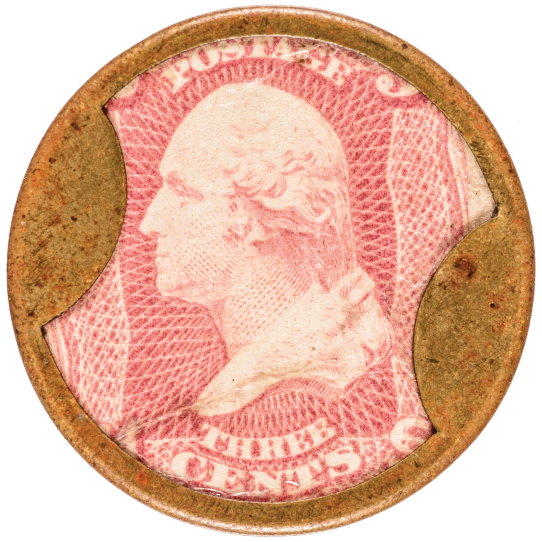 c. 1862 Civil War. Rarity-1 (100 or so known) according to Fred Reed. A beautiful specimen of this more common Three Cents denomination Medium “AYER’S” major type. It has the early reverse die state with no die break line showing. The 1861 U.S. issue red George Washington stamp is very well centered and has vivid deep fresh original color. Its mica is natural having some light surface laminations and is otherwise unbroken and crystal clear. The case is defect-free and sharp in detail with traces of original Silvering present in its recesses. A nice example for quality minded collectors.