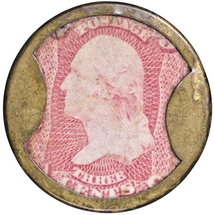 Rated as Rarity-1 (common) according to Fred Reed. This choice Encased Postage Stamp is of a more common Merchant type. The well centered rich red George Washington stamp has natural eye appeal and is attractive. The mica is clear and unbroken having some surface circulation. The reverse case is completely defect-free and a pleasing chestnut in color having some light circulation upon the obverse moon edges, the glossy smooth reverse suggesting a higher quality grade.