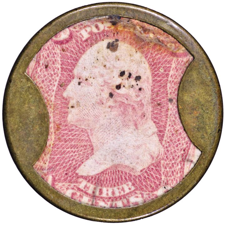 Rated a Rarity-3 (41 to 50 known) according to Fred Reed. The bright, rich red George Washington stamp is well centered having some dark scattered specks by Washington’s ear and at the top of his head. It is viewed under clear mica that has a small break at the upper right rim edge with a small thin .5” long piece lacking. The case is an even, very clean and defect-free medium chestnut in color having sharp, bold reverse legends on this scarce Large “AYER’S” major listed type.