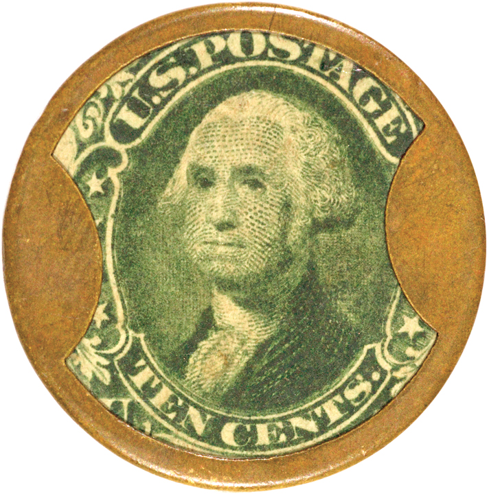 The bold deep green George Washington stamp has nice centering and is highly attractive, with just a hint of faint tone. The mica is perfectly clean, clear and unbroken with only a hint of light friction. The case is also extremely clean and smooth, having a lovely natural chestnut color with two areas of very dark tone at the left and bottom reverse edge. All of the legends are sharp and clear with excellent detail. Considering the many merchant rarities we have offered, such as Claflin, B.F. Miles and Drink Sands Ale, the fact that this is the very first specimen of its type that we have ever offered, is of real significance.