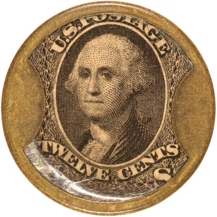 This specimen is fully original, with a lovely natural chestnut in color with excellent, sharply detailed legends, highlighted at center by underlying traces of original luster. We previously sold several examples, including EAHA Auctions, December 13, 1997, Lot 380, graded Choice EF, which sold for $2,520 and June 10, 2000, Lot 481, also graded Choice EF, selling for $2,415. This Twelve Cents denomination is a significant Encased Postage Stamp rarity.
