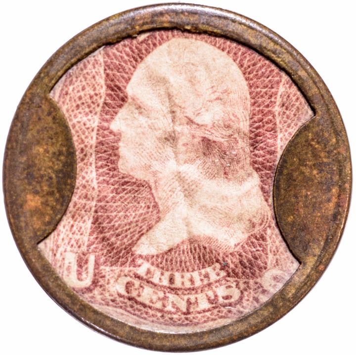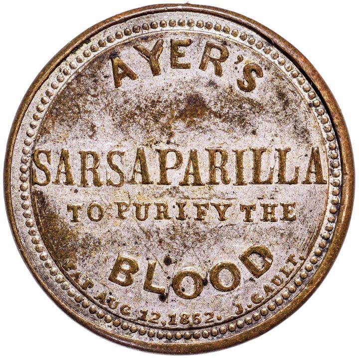 Rated as Rarity-4 (31 to 40 known) according to Fred Reed. This highly desirable Silvered Small “AYER’S” variety is difficult to locate, specially in this high quality with significant original Silvering retained. There were three examples sold in the John J. Ford, Jr. Collection sale and of those, none were graded higher than Choice Very Fine. This current example has a fresh, rich bold deep red George Washington stamp that has sharp eye appeal. It is well centered being a bit towards the top, seen through mica that is very clear and unbroken. The natural golden-chestnut case with its distinct Small “AYER’S” legends shows virtually no signs of circulation, with light wear yet having about 80% of its original Silvering shimmering on its reverse. An example certainly worthy of a premium. This example is nicer than the Lilly piece sold in the Ford IV sale. An indication that these are tough to come.