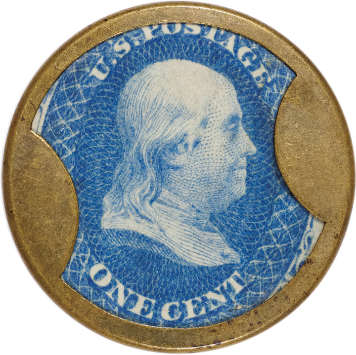 Rated as Rarity-6 (16 to 20 known) according to Fred Reed. This beautiful encasement has only some slight friction and has a lovely natural chestnut color with the back about 60% coated with bright original Silvering. The stamp is a vivid, bright deep blue and well centered. The mica is crystal clear, near perfect and clear. This type is unpriced in “Civil War Encased Postage Stamps” by Fred Reed in this high quality. Since 1995, this is only the second Silvered example of EP-6a we’ve offered, the first sold in our EAHA Auction of December 2009, Lot 529, selling for $1,416. This lovely specimen worthy of a premium having so much Silvering within its legends.