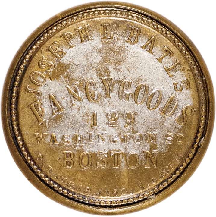 EP-6a,, HB-49, S-26, Reed BA01FG. One Cent. JOSEPH L. BATES. “FANCYGOODS” One Word. Boston. Partially Silvered. Choice About New