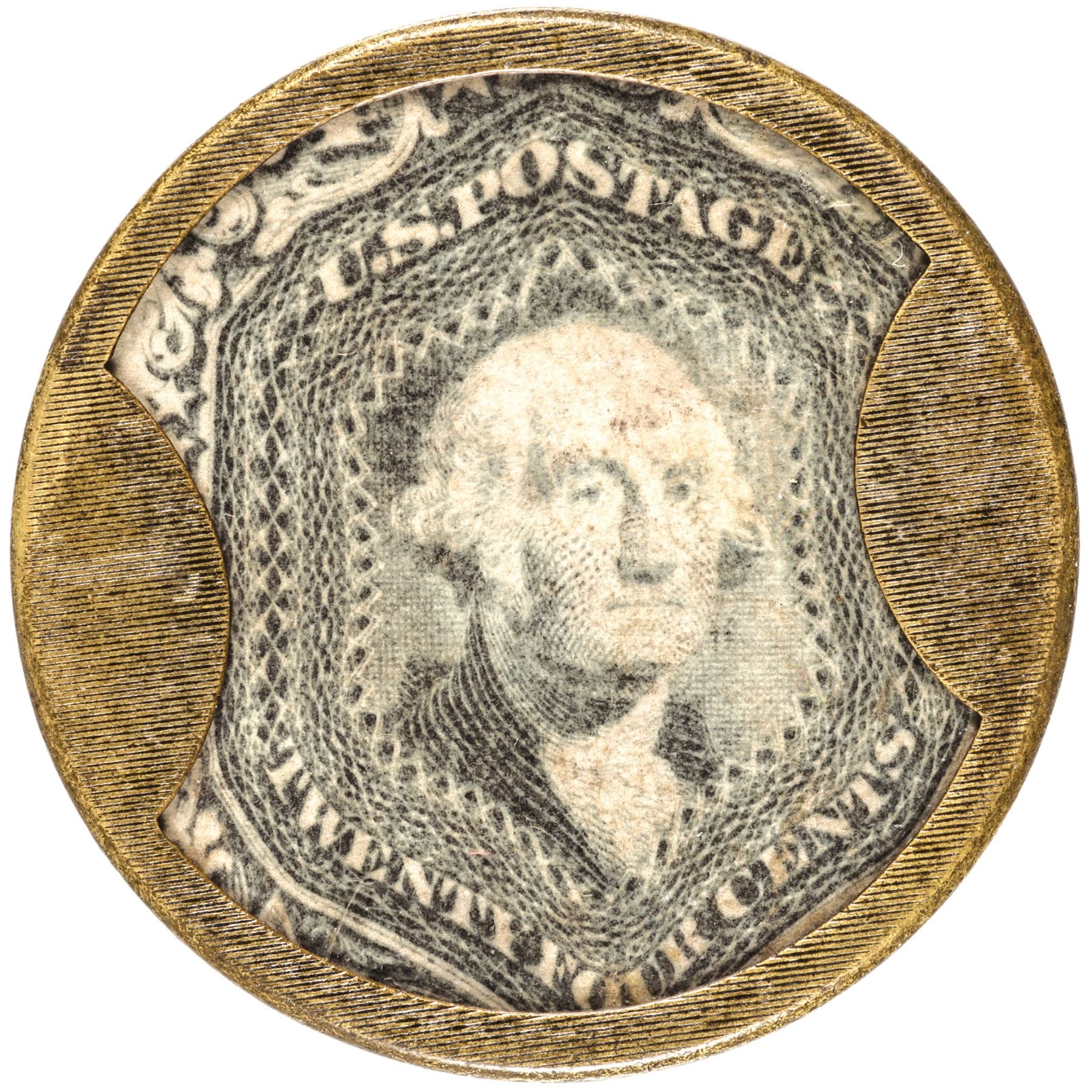 Overall, this example is extremely pleasing and of high quality. The rich, original George Washington stamp is centered just a bit to the right, seen under clear unbroken natural mica. The case is a lovely original light golden-chestnut in color, with a slightly lighter area near the center. The frame Ribbing on the front side of the case is extremely sharp and distinct being well pronounced. This current example is the finer and higher quality of the two examples from the Mayer Collection.