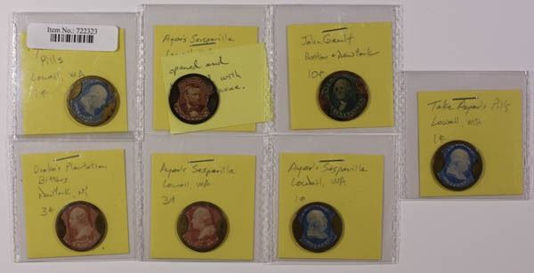 Encased Postage, collection of 7. Interesting collection that includes 1 Take Ayers Pills EP-3, 1 Ayers Cathartic Pills EP-2, 1 Ayers Sarsaparilla EP-4, 3 Ayers Cathartic Pills EP-34, 3 Drakes Plantation Bitters EP-42, 10 John Gault EP-116, and an Ayers Sarsaparilla which was opened and a later issue encased. Fine to Very Fine.