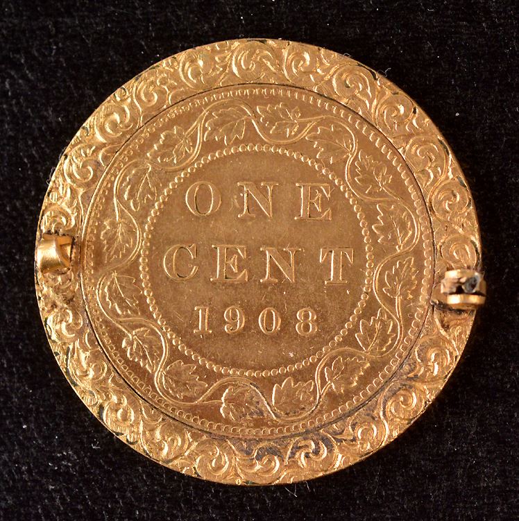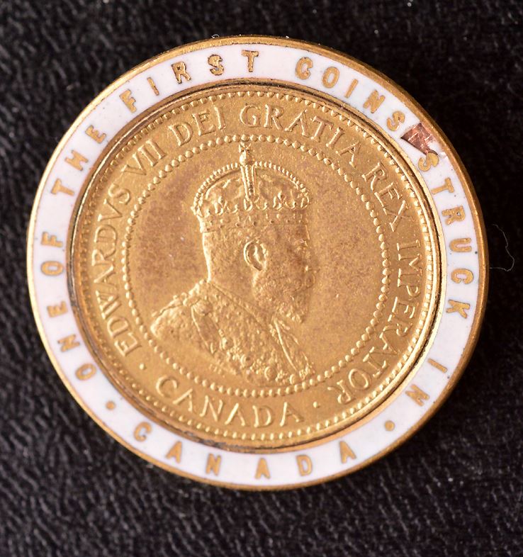 Royal Canadian Mint, Large Cent, 1908, encased, "One of the first coins struck in Canada", white enamel with gold lettering, coin and frame gilt. EF, small chip in enamel, brooch mount, missing pin