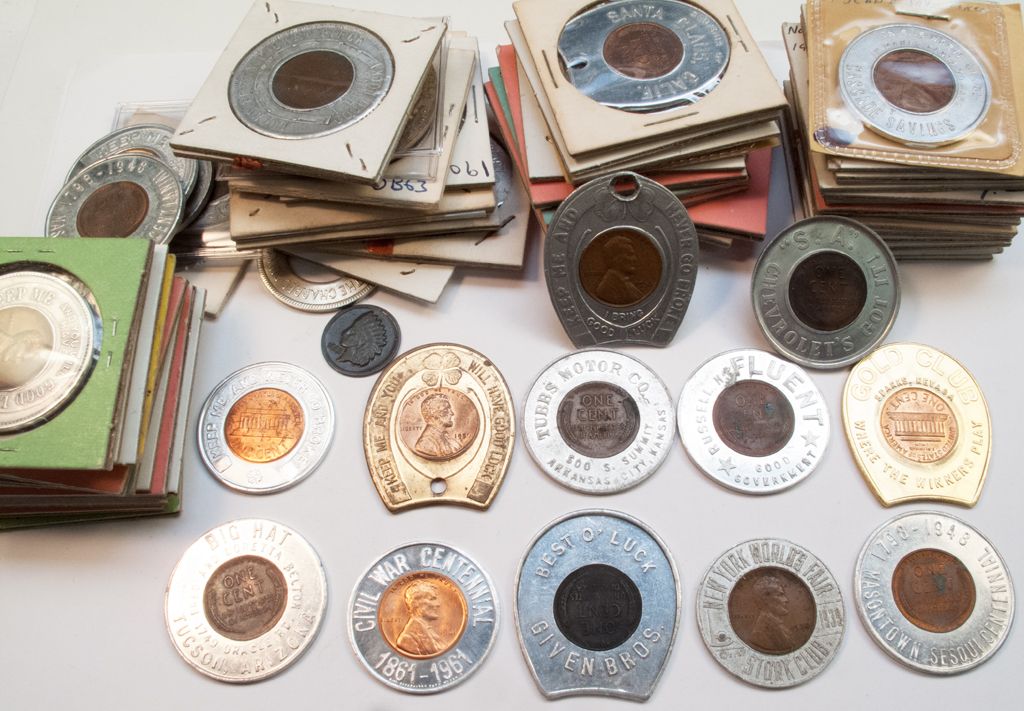 Approx. 70 various encased cents, two of which are encased Morgan Silver Dollars!