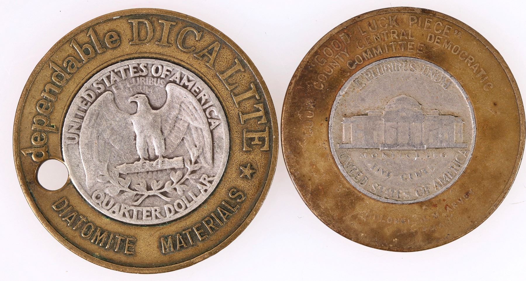 Two encased coins: 1) 1954 Washington quarter; VG-F condition; brass casing, with hole: Dicalite / 1930-1955 / Silver Anniversary // Dependable Dicalite / Diatomite Materials; 37 mm. 2) 1950 Jefferson nickel; Vg-F condition; brass casing; Democratic National Conference Chicago May 1950. 36 mm.