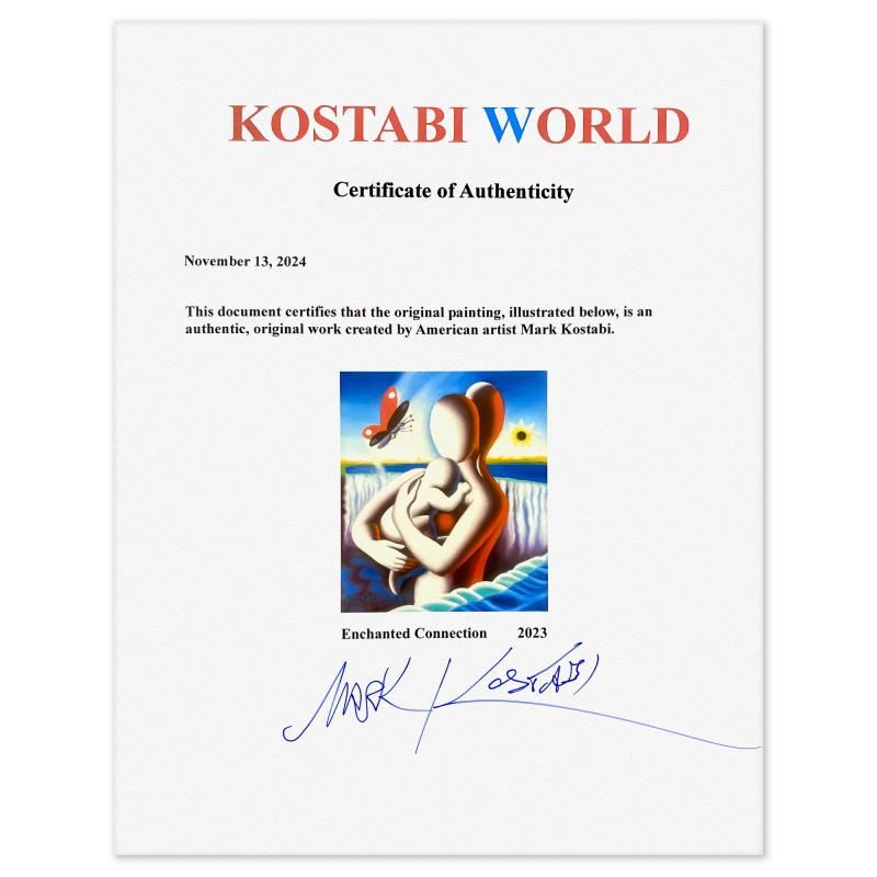 "Enchanted Connection" is an original oil painting on canvas by Mark Kostabi, hand signed by the artist. This piece comes framed. Includes Certificate of Authenticity. Measures approx. 22" x 20" (frame), 12" x 10" (image). This item requires special handling and may have a longer than usual turnaround.